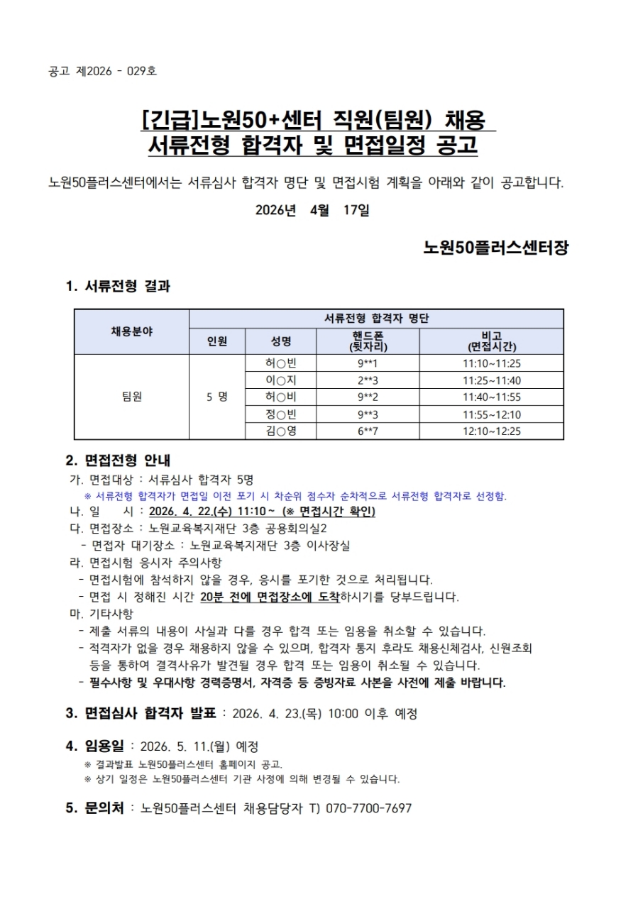 [긴급]노원50+센터 직원(팀원) 채용 서류전형 합격자 및 면접일정 공고