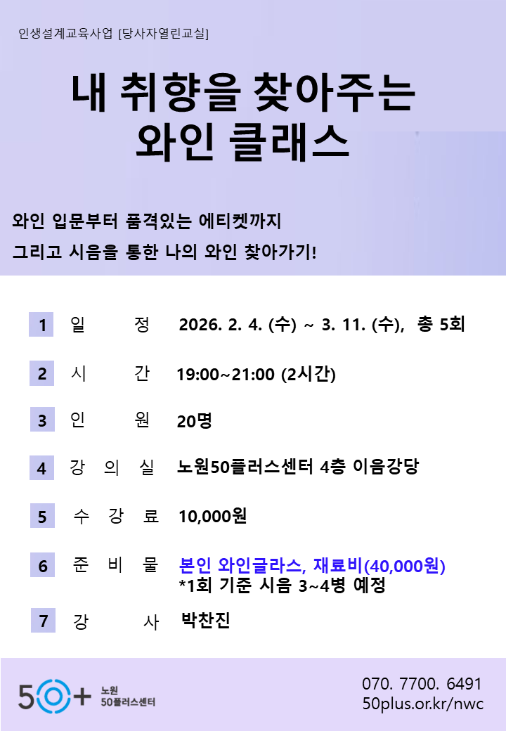 (5 회차) 2026.03.11(19:00 ~ 21:00) 이음강당(4F) 박찬진 와인에티켓 및 페어링