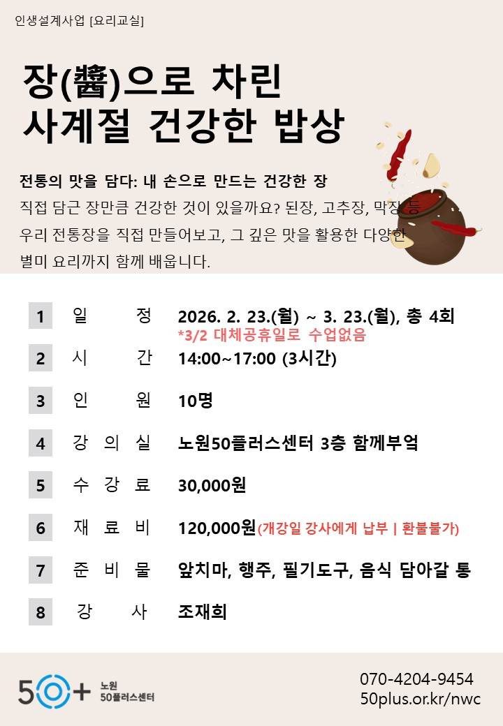 (1 회차) 2026.02.23(14:00 ~ 17:00) 함께부엌(3F) 조재희 시래기 된장 지짐이 맥적구이 재료비 12만원, 앞치마, 장바구니(담아갈 봉투), 개인 용기