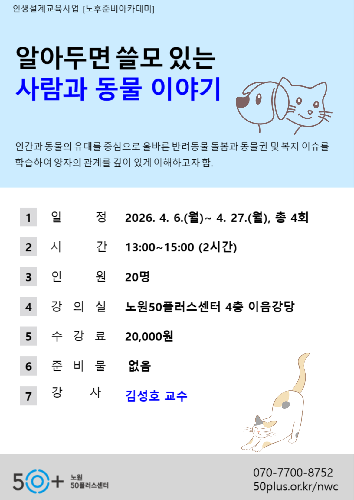 (2 회차) 2026.04.13(13:00 ~ 15:00) 이음강당(4F) 김성호(교수) 반려동물, 잘 돌보는 법은 따로 있다