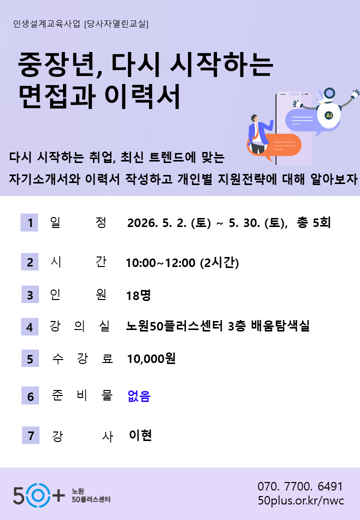 (4 회차) 2026.05.23(10:00 ~ 12:00) 배움탐색실(3F) 이현 [다시 시작하는 면접, 할 수 있다(2)]