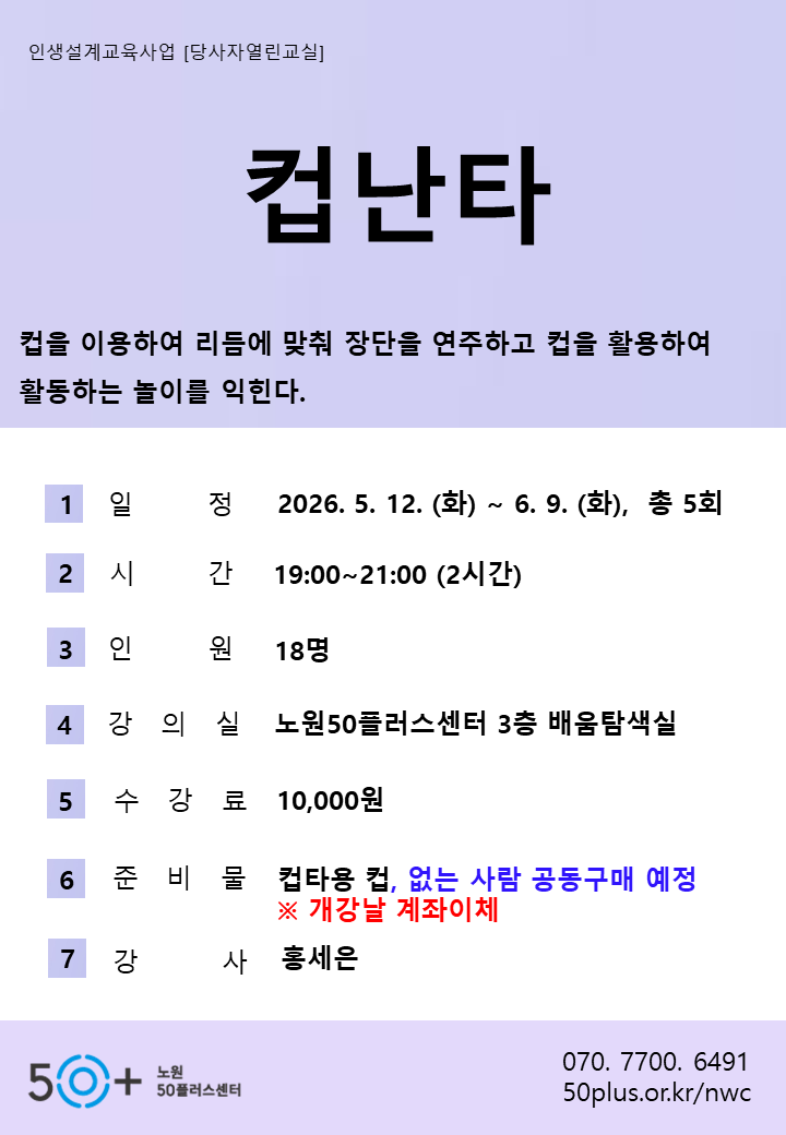(1 회차) 2026.05.12(19:00 ~ 21:00) 배움탐색실(3F) 홍세은 [컵 난타 OT]