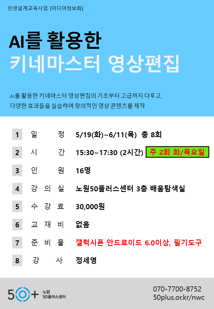 (8 회차) 2026.06.11(15:30 ~ 17:30) 배움탐색실(3F) 정세영 ◎ AI고급 편집 기술 및 효과 적용