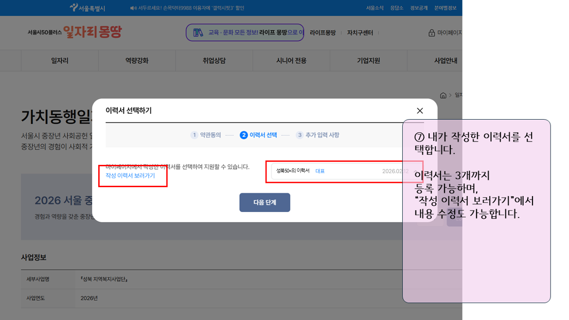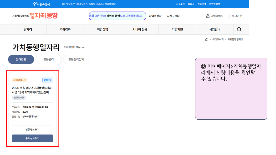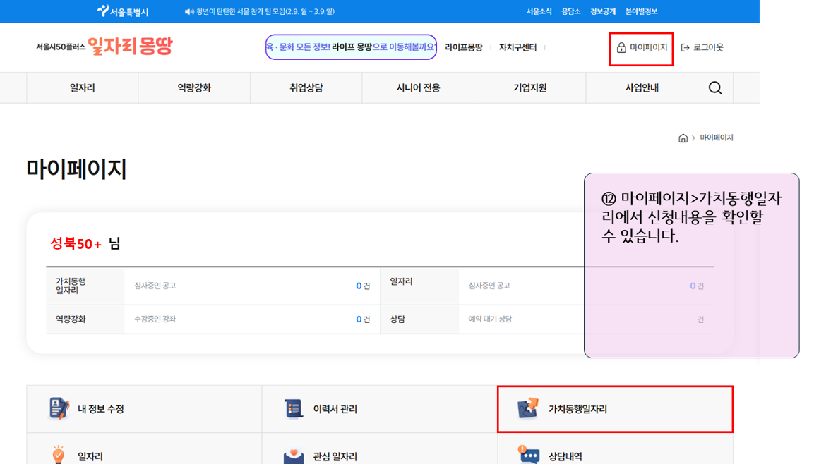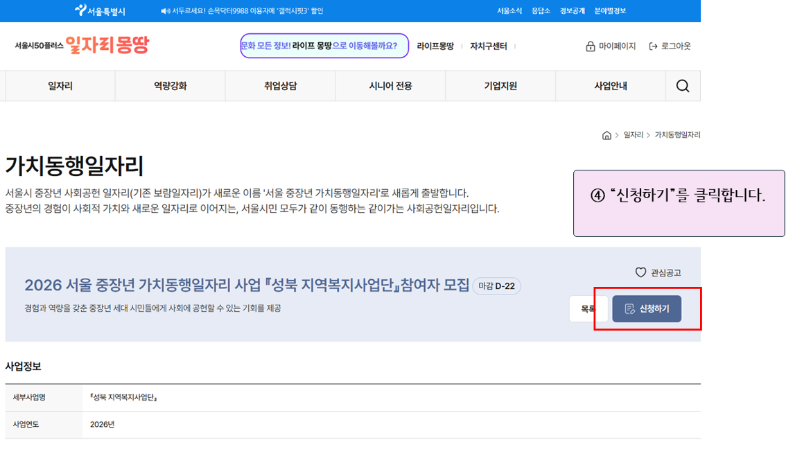 서울50플러스재단 홈페이지 개편에 따라 가치동행일자리 성북지역복지사업단 신청 방법을 안내 합니다.