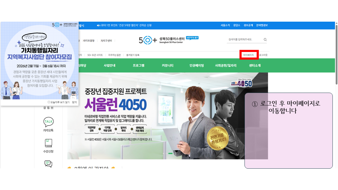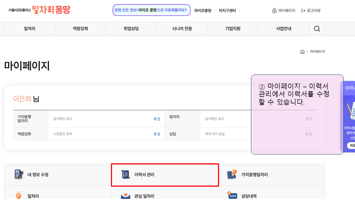 서울50플러스재단 홈페이지 개편에 따라 가치동행일자리 성북지역복지사업단 이력서 작성법을 안내 합니다.