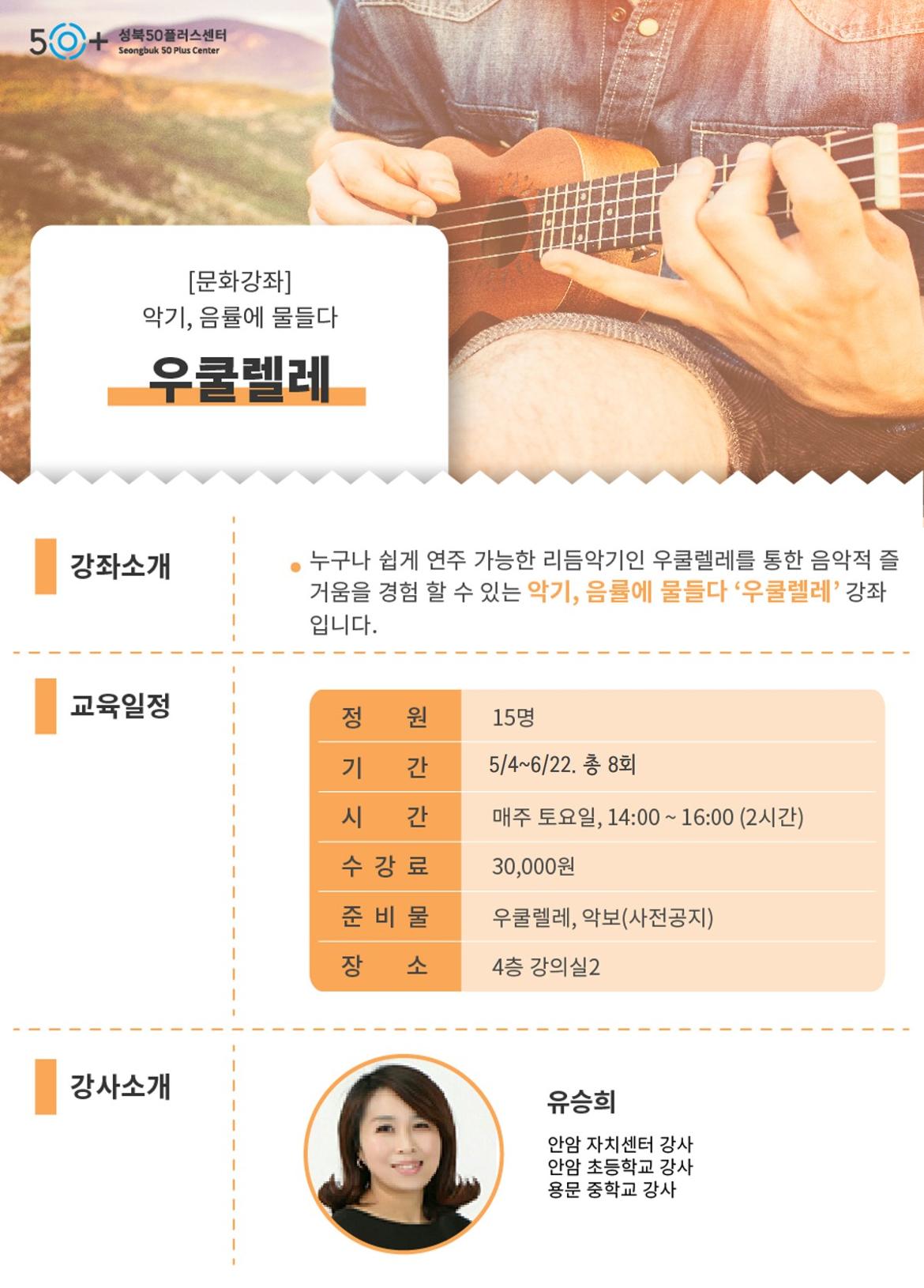 4층 강의실2 | 유승희 | 우쿨렐레 이해, 오른손 스트로크(엄지손가락 4비트 다운스트로크, 오른손 자세, 손모양) | 우쿨렐레, 악보(사전공지) |