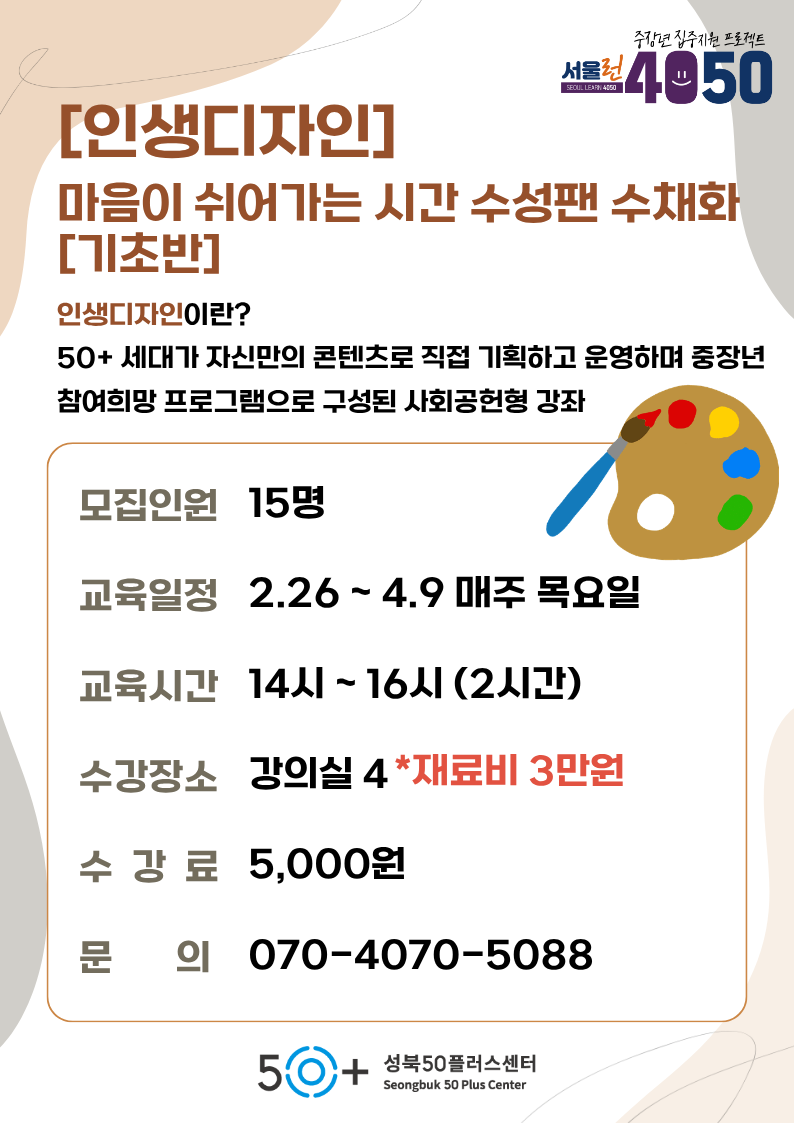 본 강좌는 교육기회 확대를 위해 성북50플러스센터 강의를 처음 수강하시는 분과 성북구민을 우선 선정하여 운영합니다. 동일 기준 내 선발은 접수순으로 진행됩니다.