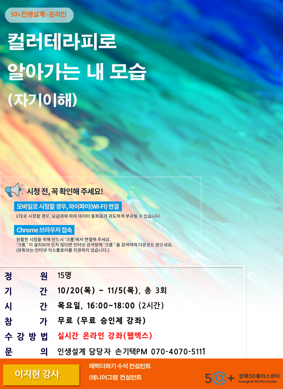 이지현 | 컬러테라피 : 각 컬러별 의미를 이해하고 실생활 속 컬러 활용법을 이해합니다. 컬러 힐링 상담법을 익힙니다. | 실시간 온라인 강좌 (Webex) |