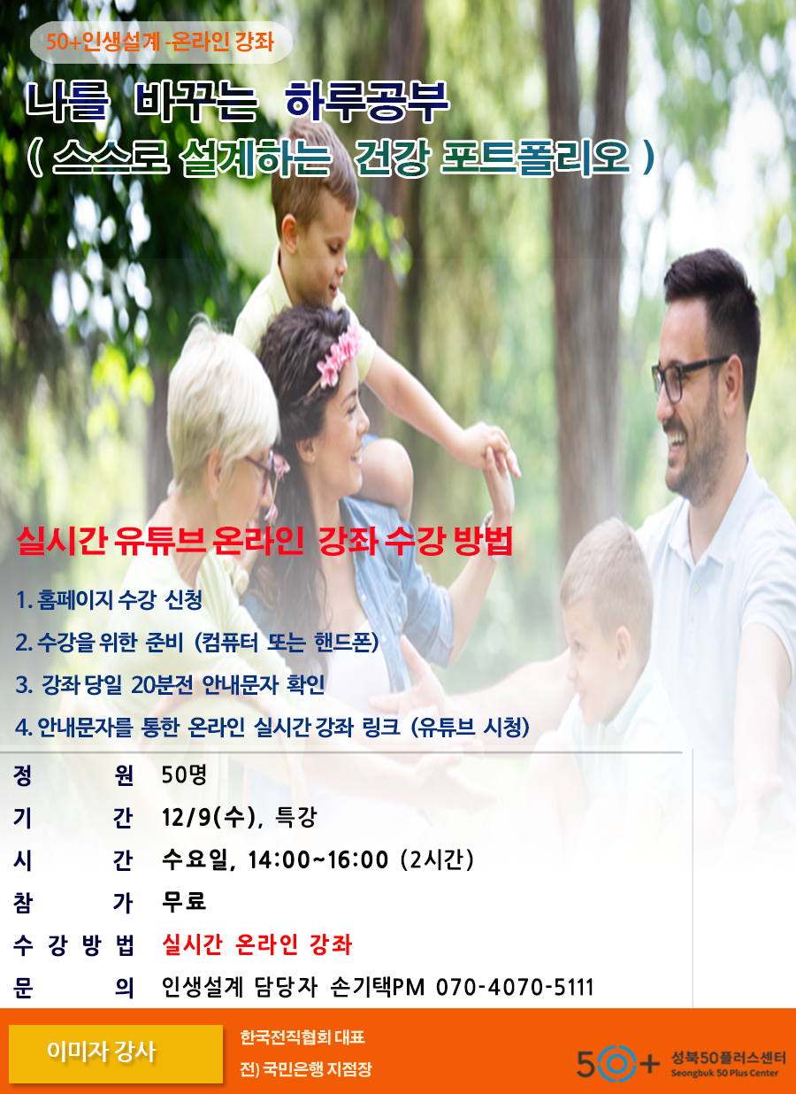 이미자 | [실시간 유튜브 온라인 강좌] 몸과 마음의 작동에 따른 건강관리 : 100세 건강을 위한 위대한 나의 발견! - 중장년 이후에 나타나는 질병 이해와 예방 - 스트레스 이해와 극복을 위한 몸과 마음 설명서 - 몸과 마음을 지키는 지혜로운 건강관리 |