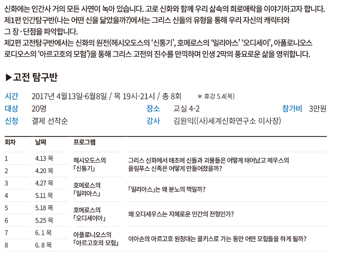교실 4-2 | 중부캠퍼스 강사진 | 헤시오도스의 「신통기」- 그리스 신화에서 태초에 신들과 괴물들은 어떻게 태어났고 제우스의 올림푸스 신족은 어떻게 만들어졌을까? | - |
