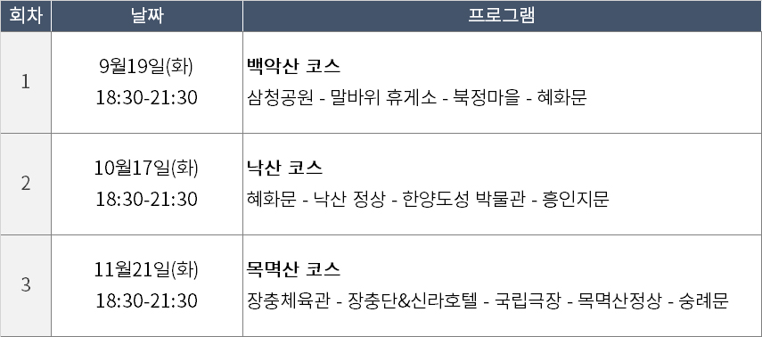 중부캠퍼스 강사진 | 백악산 코스 : 삼청공원 - 말바위 휴게소 - 북정마을 - 혜화문 | 등산화, 랜턴(필수) | |