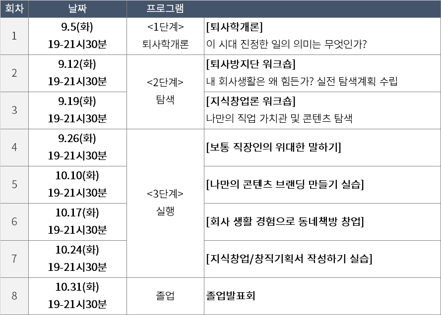 대상 l 회사 생활과 퇴사 이후의 길에 대해 고민하고 준비하고 싶은 3040 직장인 / 20명