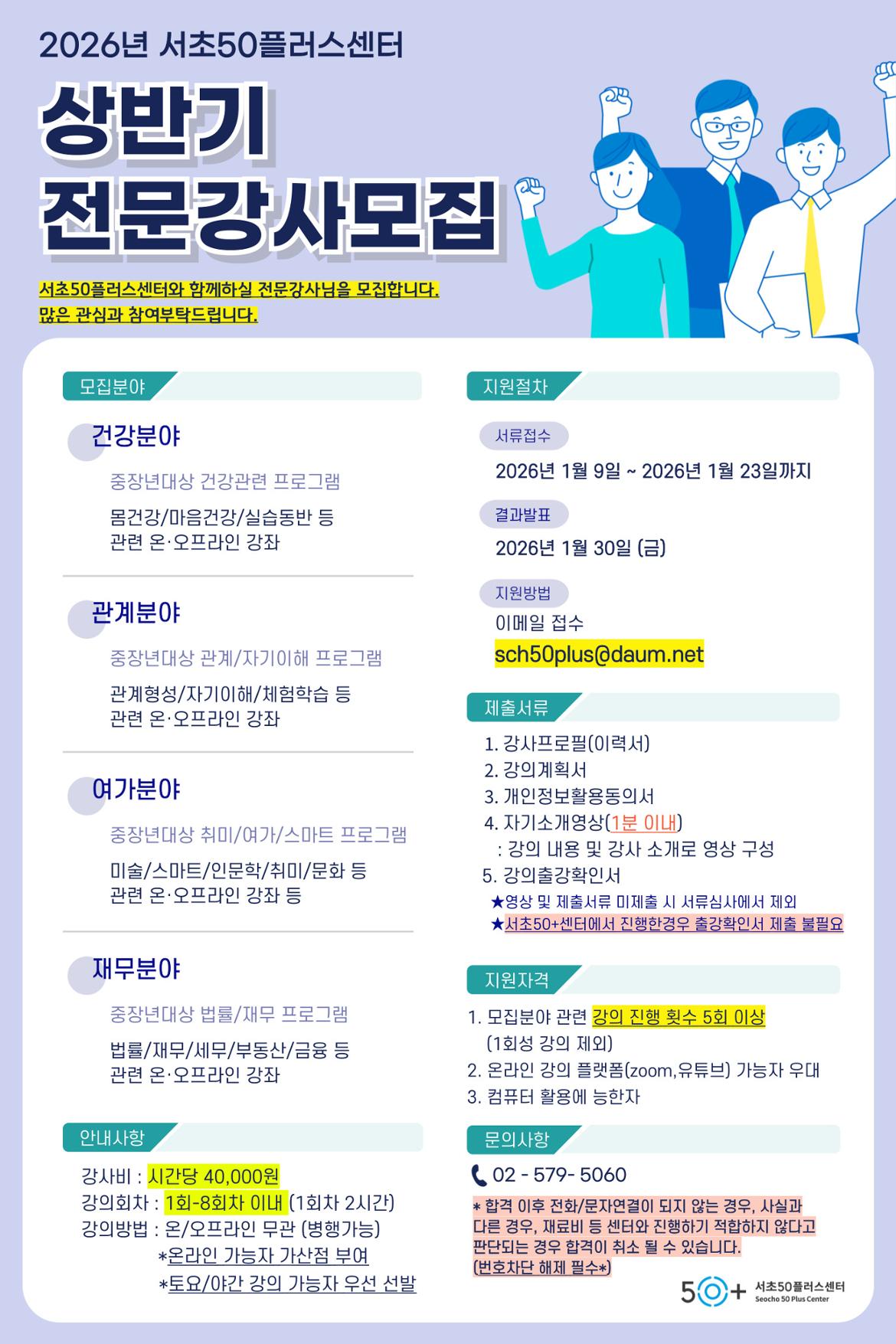 전화02-579-5060 이메일 sch@50center.or.kr / seocho50plus@gmail.com