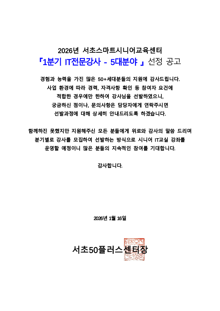 2026년 1분기 서초스마트시니어교육센터 IT전문강사 선정자 공고