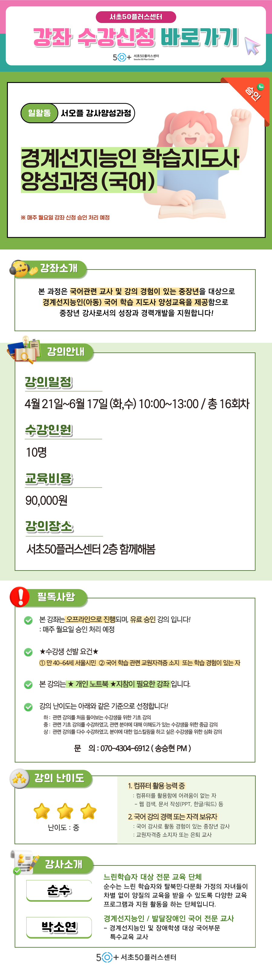[50+강사] 경계선지능인 학습지도사 양성과정(국어)