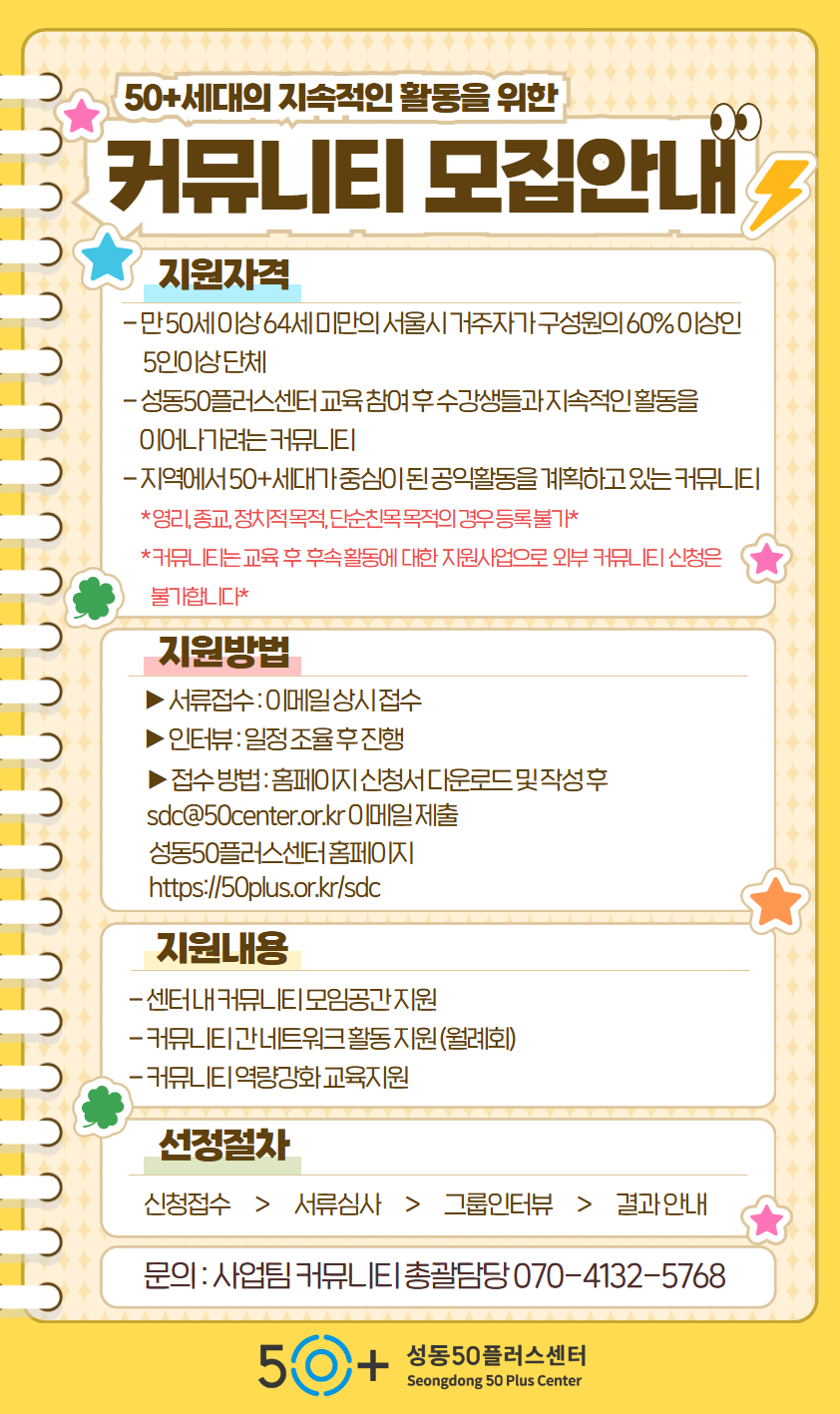 성동50플러스센터 서울특별시 성동구 왕십리로 241(서울숲 더샵) 3층 사업자등록번호 : 380-80-02245 대표자 : 이정아