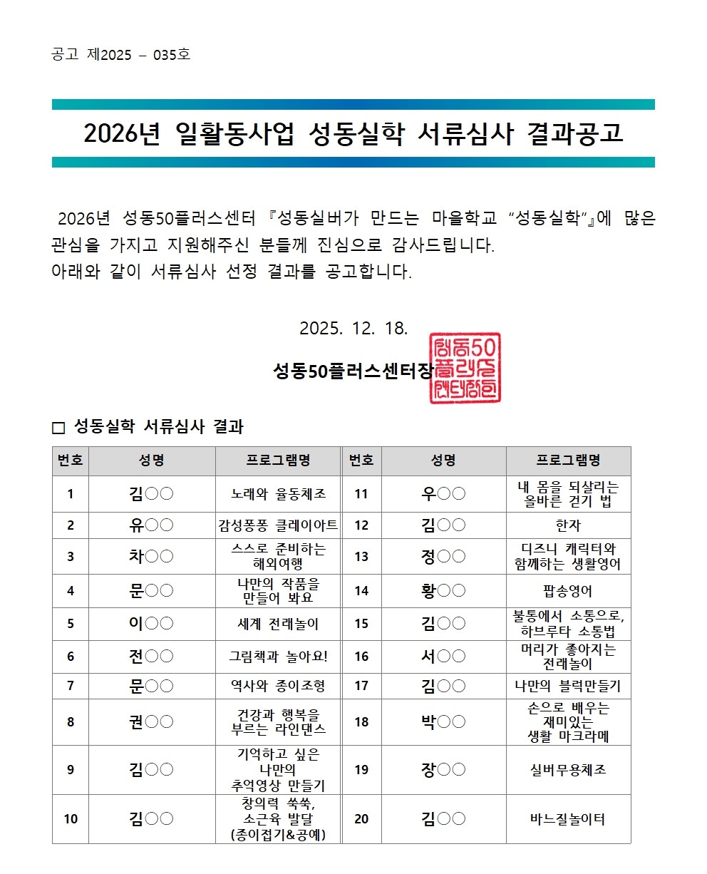 서울시 성동센터 | [발표] 2026년 일활동사업 성동실학 강사모집 서류심사 결과안내