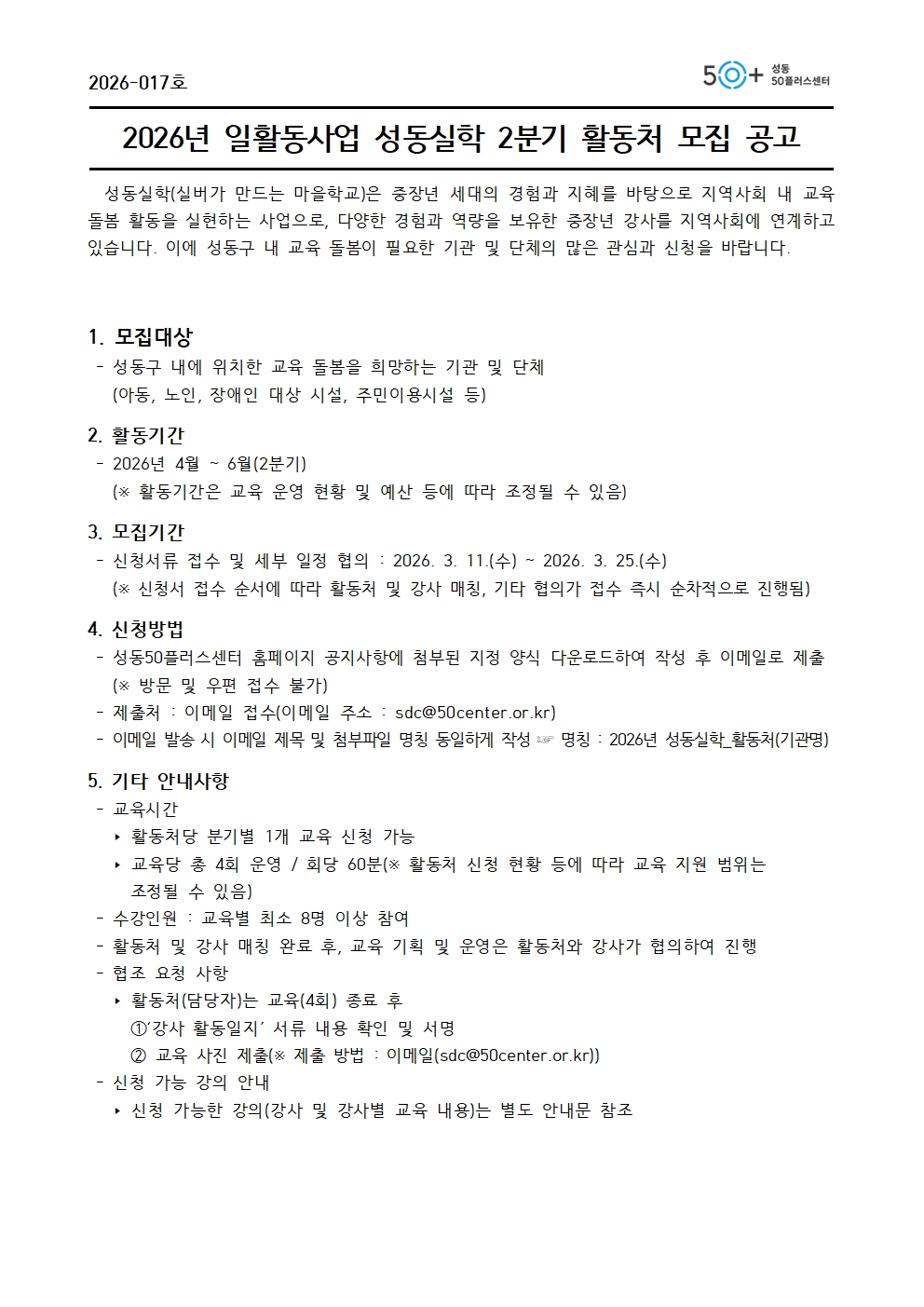 • 첨부파일표시 아이콘2026년 일활동사업 성동실학 2분기 활동처 모집 안내문.pdf