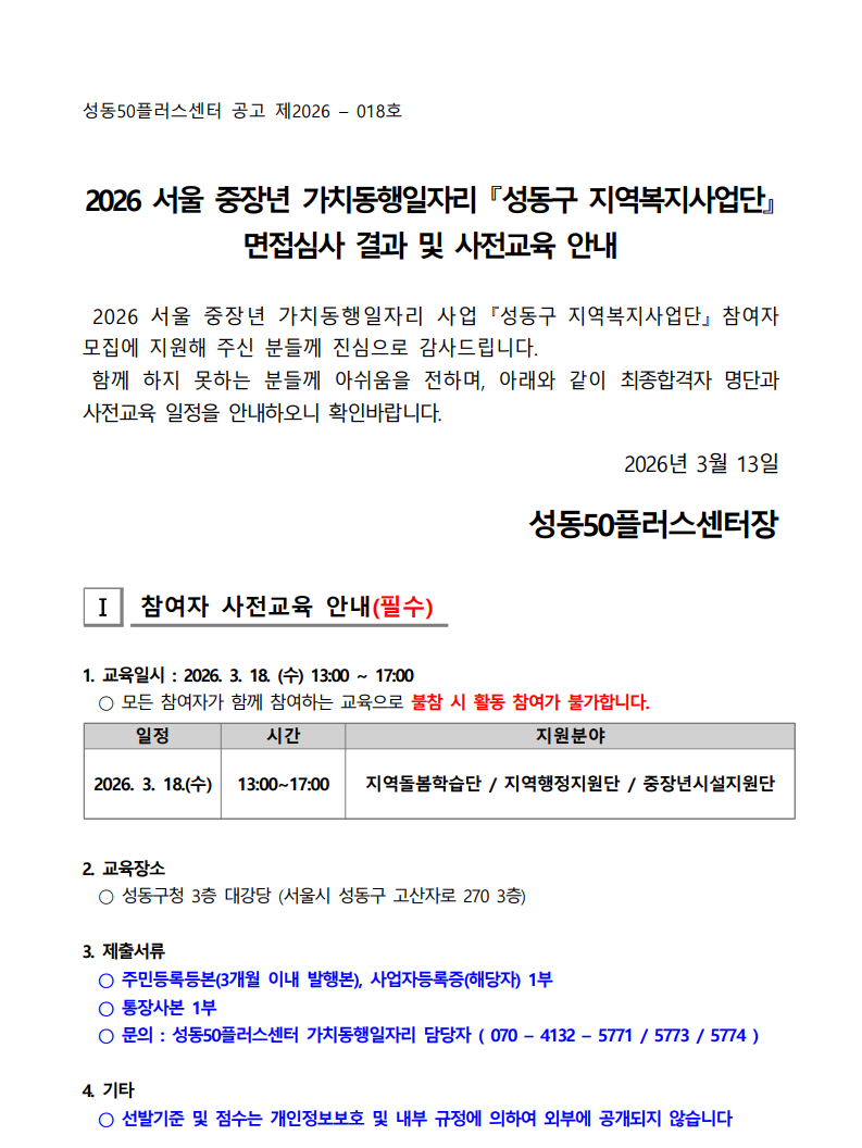 서울시 성동센터 | [발표] 2026 서울 중장년 가치동행일자리 『성동구 지역복지사업단』 면접심사 결과 및 사전교육 안내