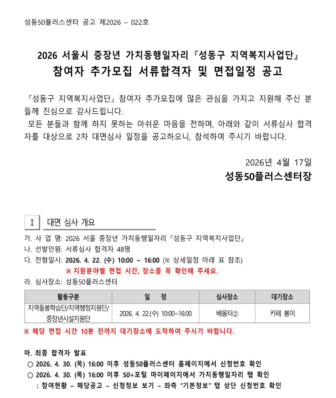 서울시 성동센터 | [발표] 2026 서울 중장년 가치동행일자리사업 『성동구 지역복지사업단』 추가모집 서류합격자 및 면접일정 공고