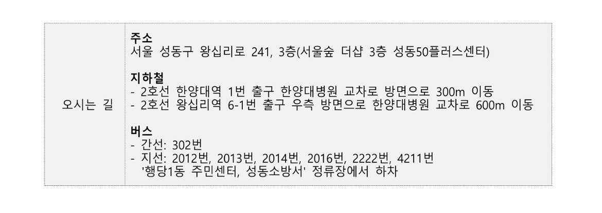 성동50플러스센터 서울특별시 성동구 왕십리로 241(서울숲 더샵) 3층 사업자등록번호 : 380-80-02245 대표자 : 이정아