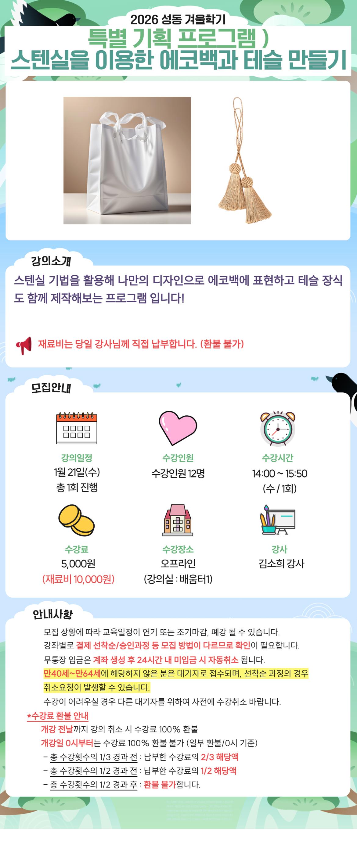 (1 회차) 2026.01.21(14:00 ~ 16:00) 배움터-1 김소희 [에코백 제작, 테슬 제작]