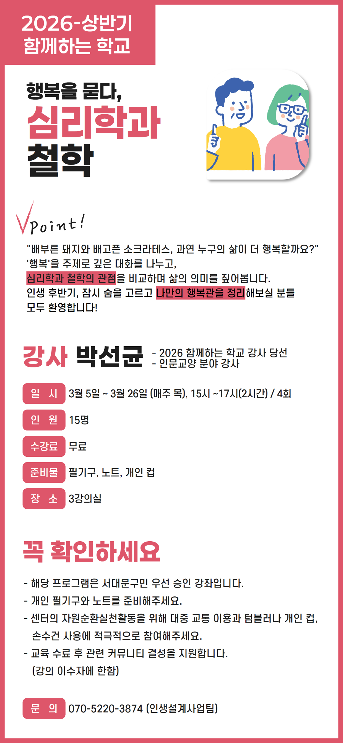 (1 회차) 2026.03.05(15:00 ~ 17:00) 강의실3 박선균 [내 인생의 사계절: 행복의 재발견]