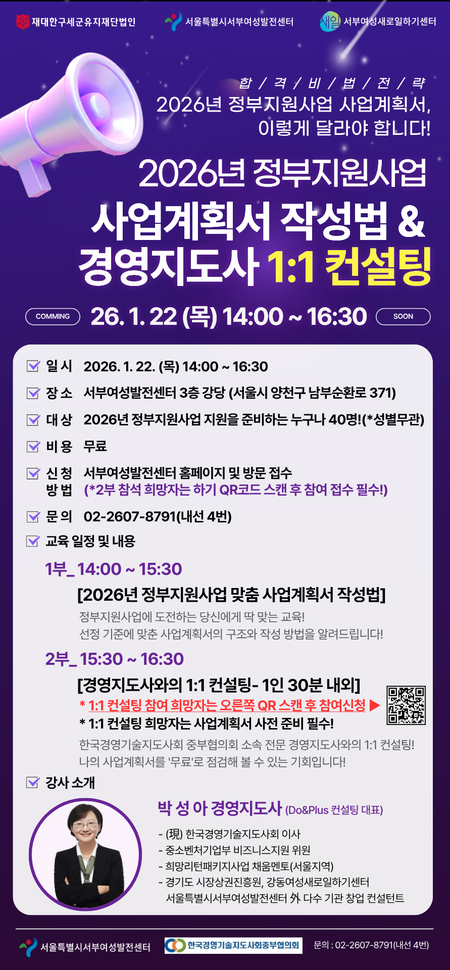 서울시서부여성발전센터에서는 예비·초기 창업자를 대상으로「2026년 정부지원사업 맞춤 사업계획서 작성법 및 경영지도사 1:1 컨설팅」특강을