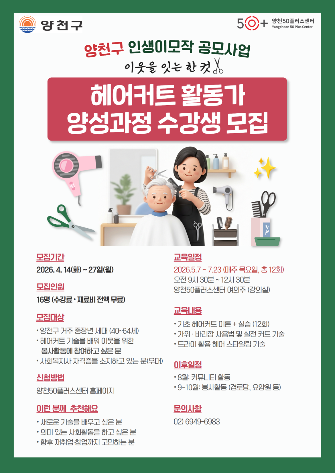 양천50플러스센터에서 중장년 대상 헤어커트 활동가 양성과정 참여자를 모집합니다.