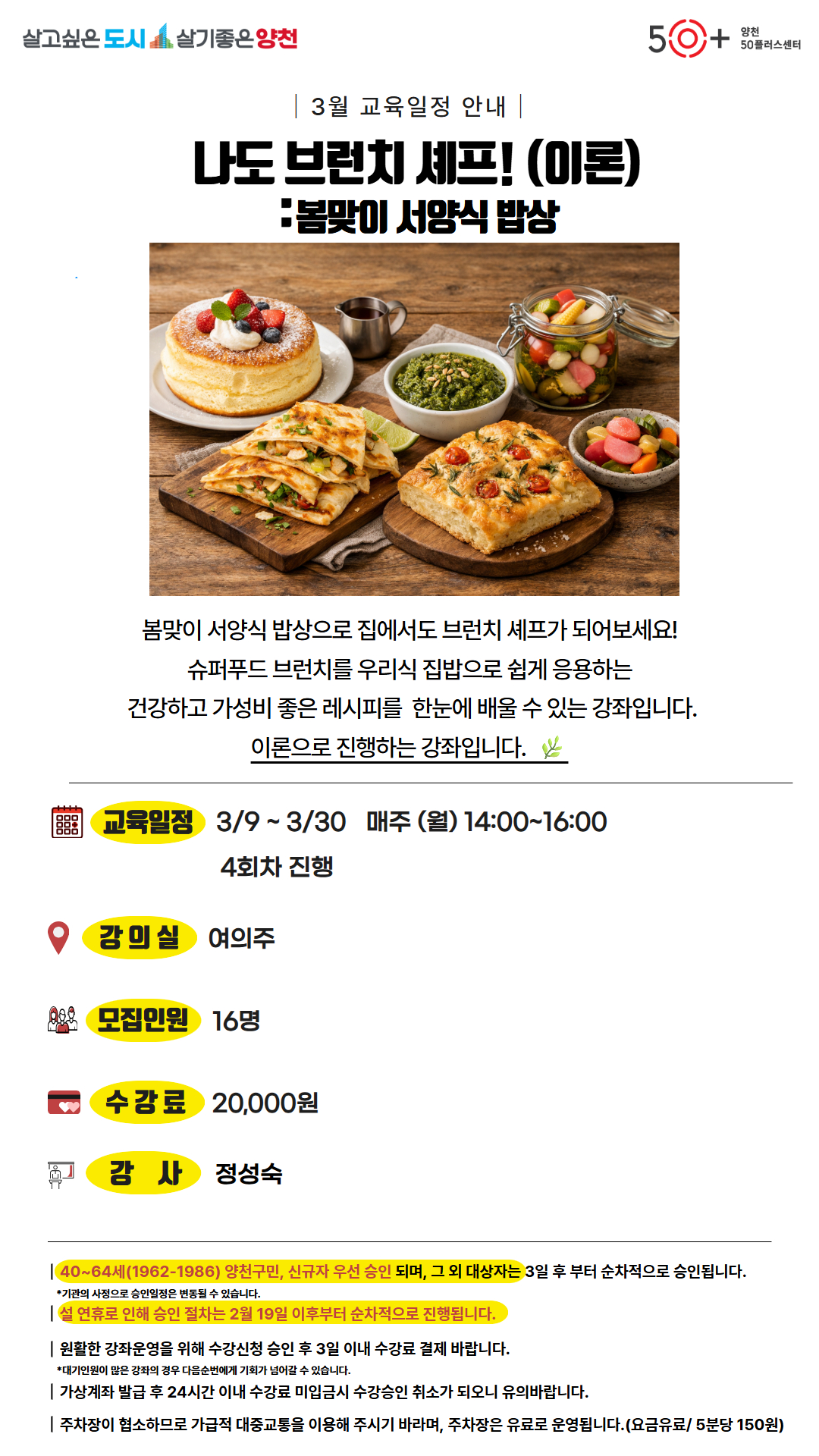 (3 회차) 2026.03.23(14:00 ~ 16:00) 여.의.주 정성숙 주제 : 오븐없이 직접 굽는 빵과 쉬운데 맛있는 핫브런치 메뉴