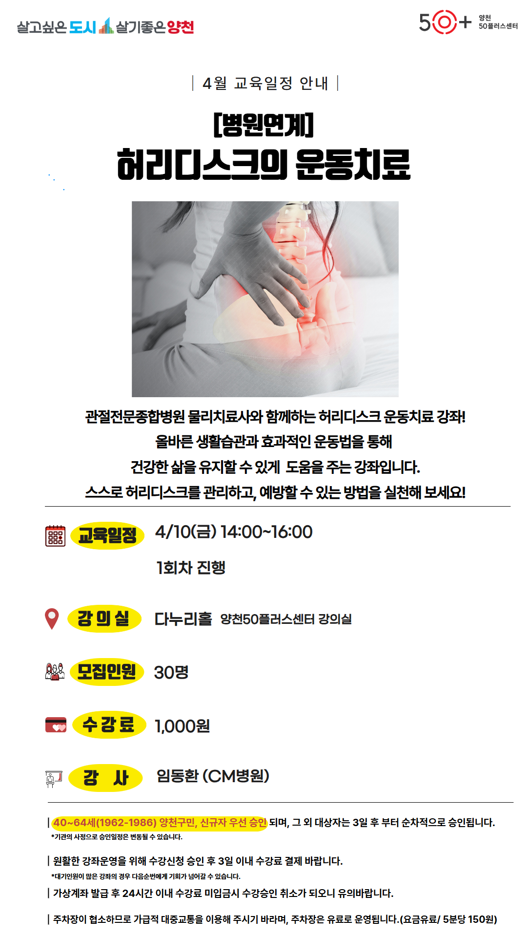 (1 회차) 2026.04.10(14:00 ~ 16:00) 다누리홀 CM병원 주제 : 허리디스크의 운동치료