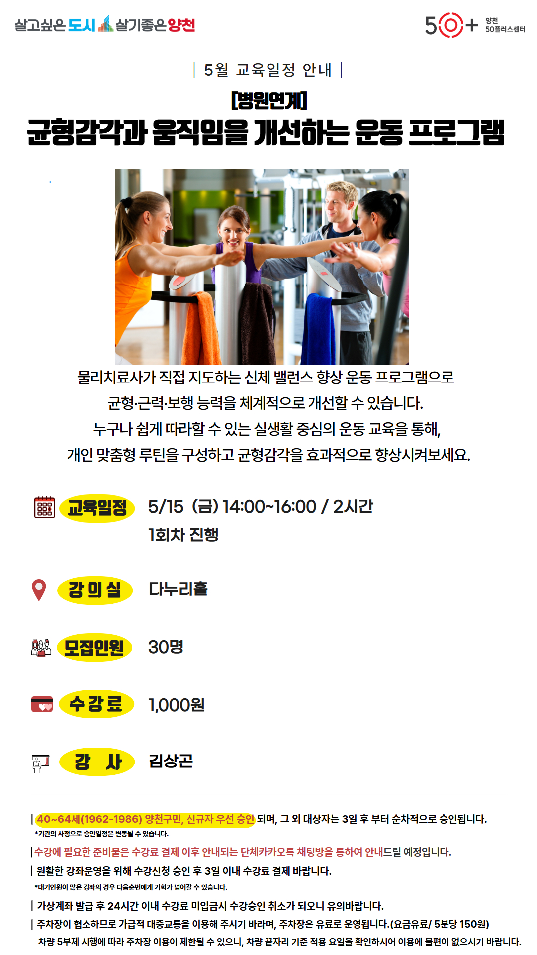 (1 회차) 2026.05.15(14:00 ~ 16:00) 다누리홀 CM병원 주제 : 균형감각과 신체 움직임을 향상시킬 수 있는 운동법
