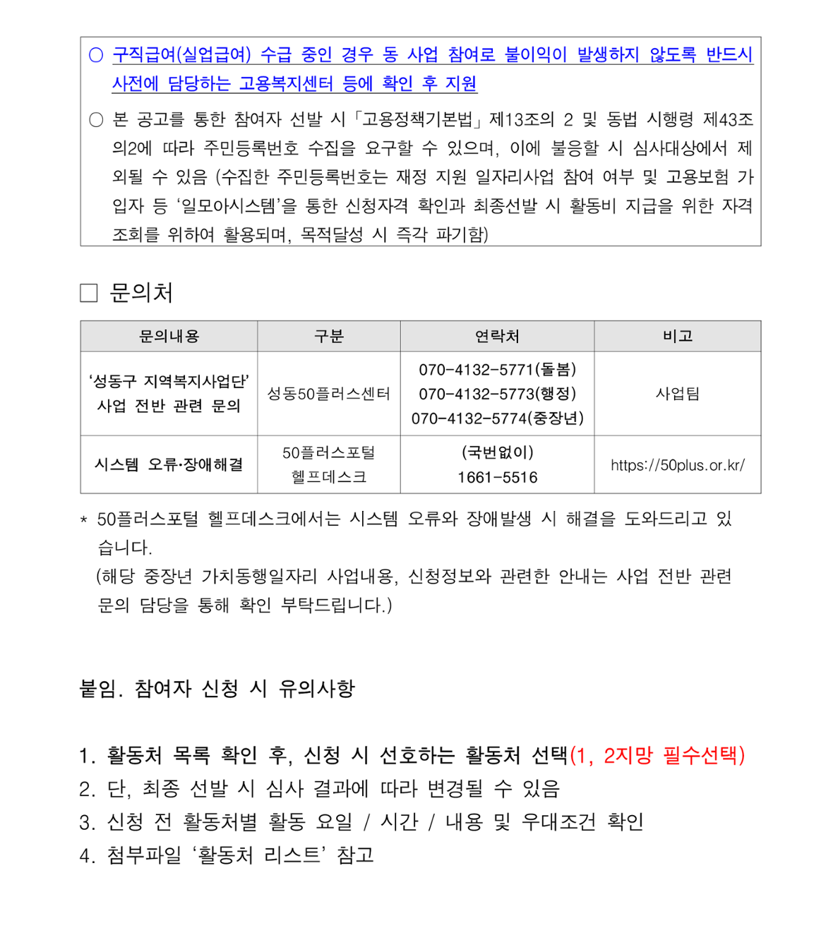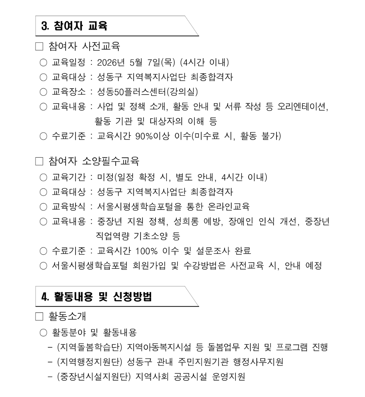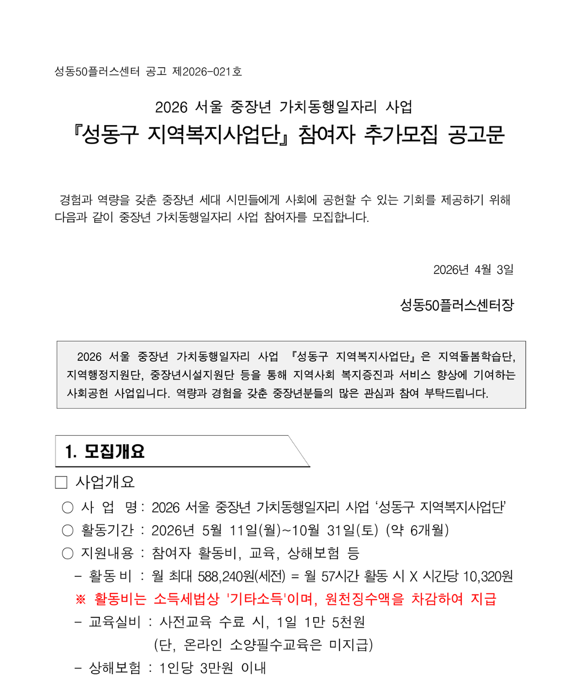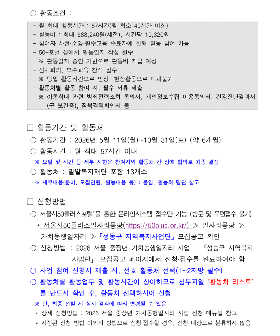 2026년 서울 중장년 가치동행일자리 사업 '성동구 지역복지사업단' 참여자 추가모집 공고마감 D-9