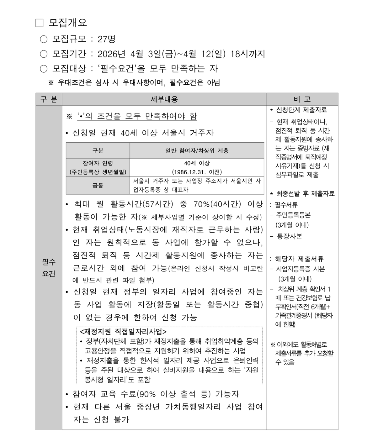 - 40세 이상(차상위 계층도 동일)인 자 중 주민등록상 서울시 거주자 또는 사업장 주소지가 서울시인 사업자등록증 상 대표자 - 월 활동시간(57시간) 중 70%(40시간)이상 활동이 가능한 자 - 참여자 역량교육 수료(90%이상), 소양교육 수료(100%) 가능한 자