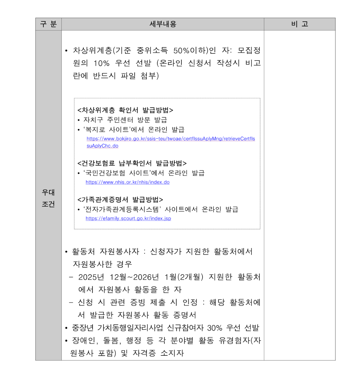 - 활동처 자원봉사자 : 신청자가 지원한 활동처에서 자원봉사을 한 자 (2025.12. ~ 2026.3.) - 신청 시 관련 증빙 제출 시 인정 : 활동처에서 발급한 자원봉사 활동 증명서 - 중장년 가치동행일자리 사업 신규 참여자 30% 우선 선발 - 차상위 계층(기준 중위소득 50%이하), 모집정원의 10% 우선 선발 - 각 사업별 관련분야 유경험자