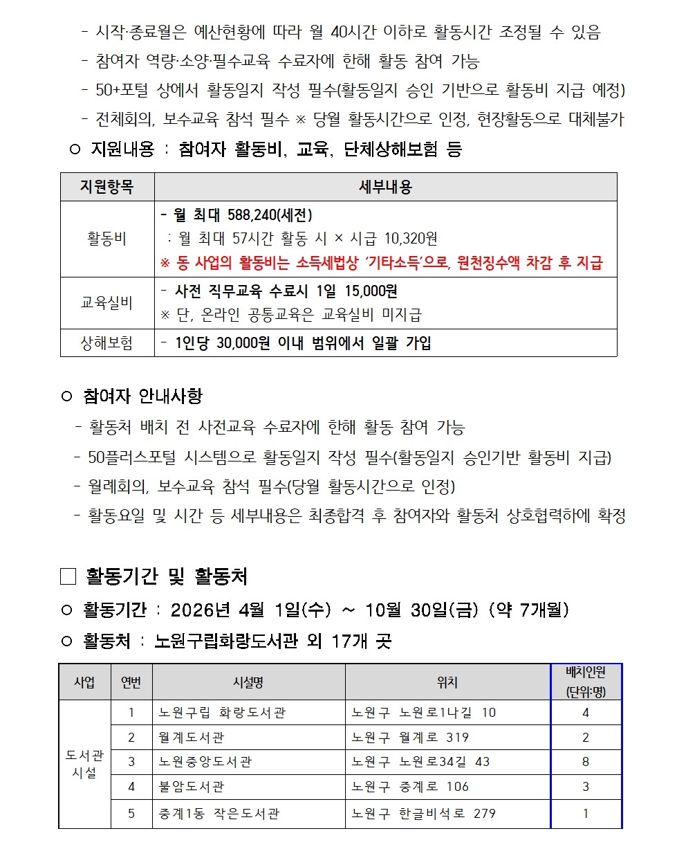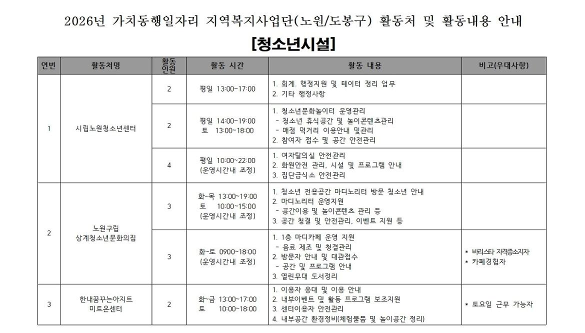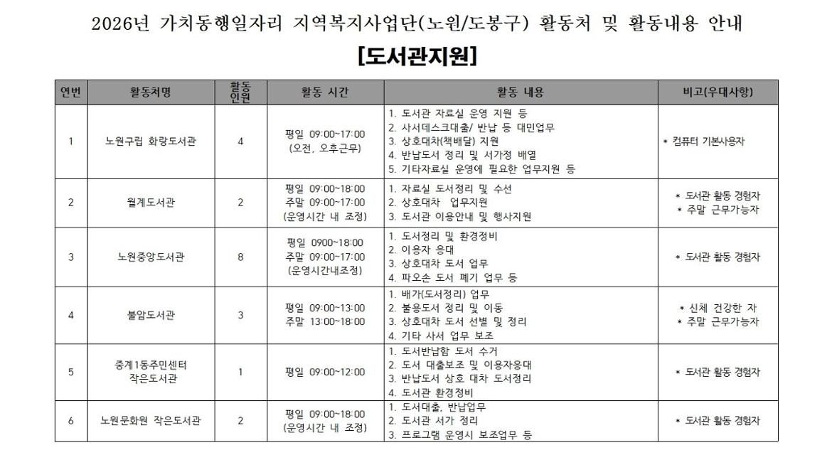 2026년 가치동행일자리 노원/도봉구 지역복지사업단[도서관시설, 청소년시설] 참여자 모집마감 D-14