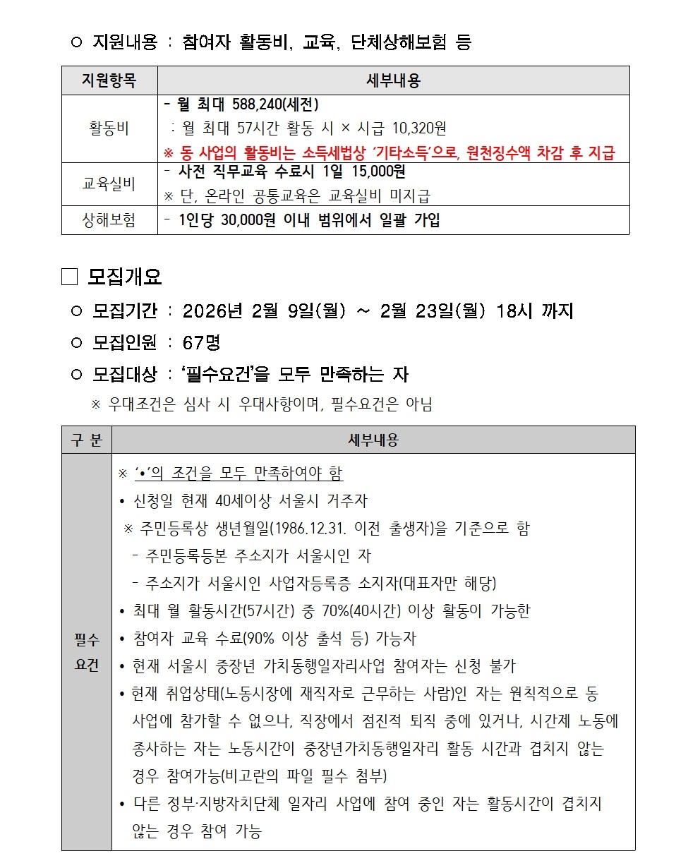 - 40세 이상 서울시 거주자(차상위계층도 동일) : 주민등록상 생년월일 1986.12.31. 이전출생자 중 주민등록상 서울시 거주자 또는 사업장 주소지가 서울시인 사업자등록증 상 대표자 - 월 활동시간(57시간) 중 70%(40시간)이상 활동이 가능한 자 - 참여자 역량교육 수료(90%이상), 소양교육 수료(100%) 가능한 자