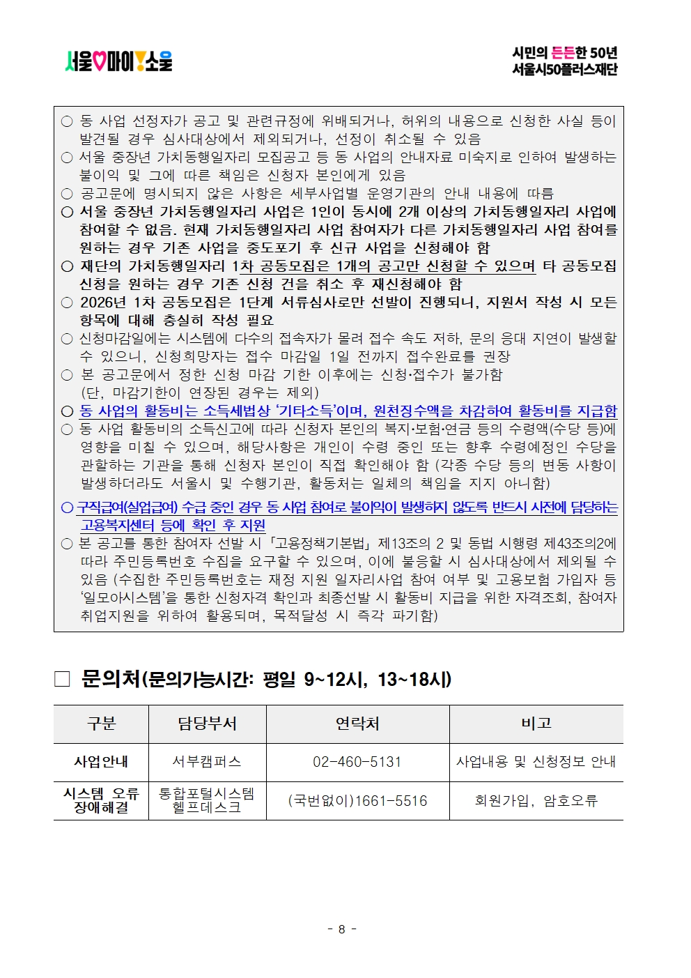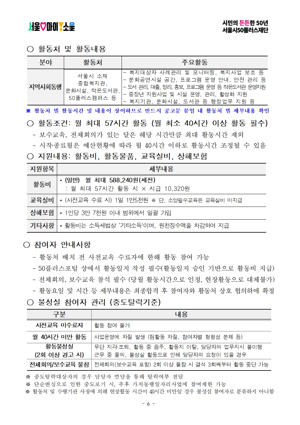 • 40세 이상(1986.12.31.이전 출생자, 차상위 계층도 동일)인 자 중 주민등록상 서울시 거주자 또는 사업장 주소지가 서울시인 사업자등록증 상 대표자 • 월 활동시간(57시간) 중 70%(40시간)이상 활동이 가능한 자 • 모집공고 최종합격 후 참여자 사전교육 수료(90% 이상), 소양필수교육 수료(100%) 가능한 자 • 모집공고 마감일 전까지 재단에서 운영하는 가치동행일자리 기초교육 수료한 자