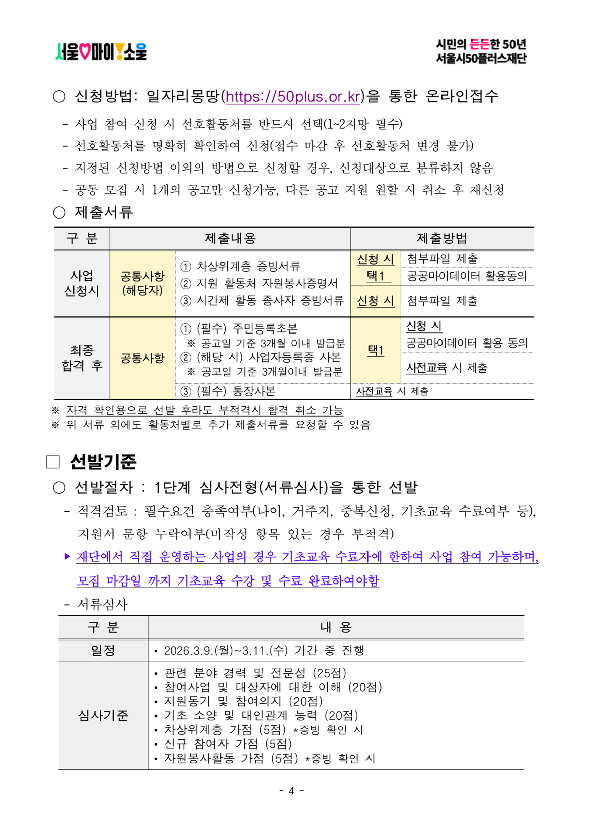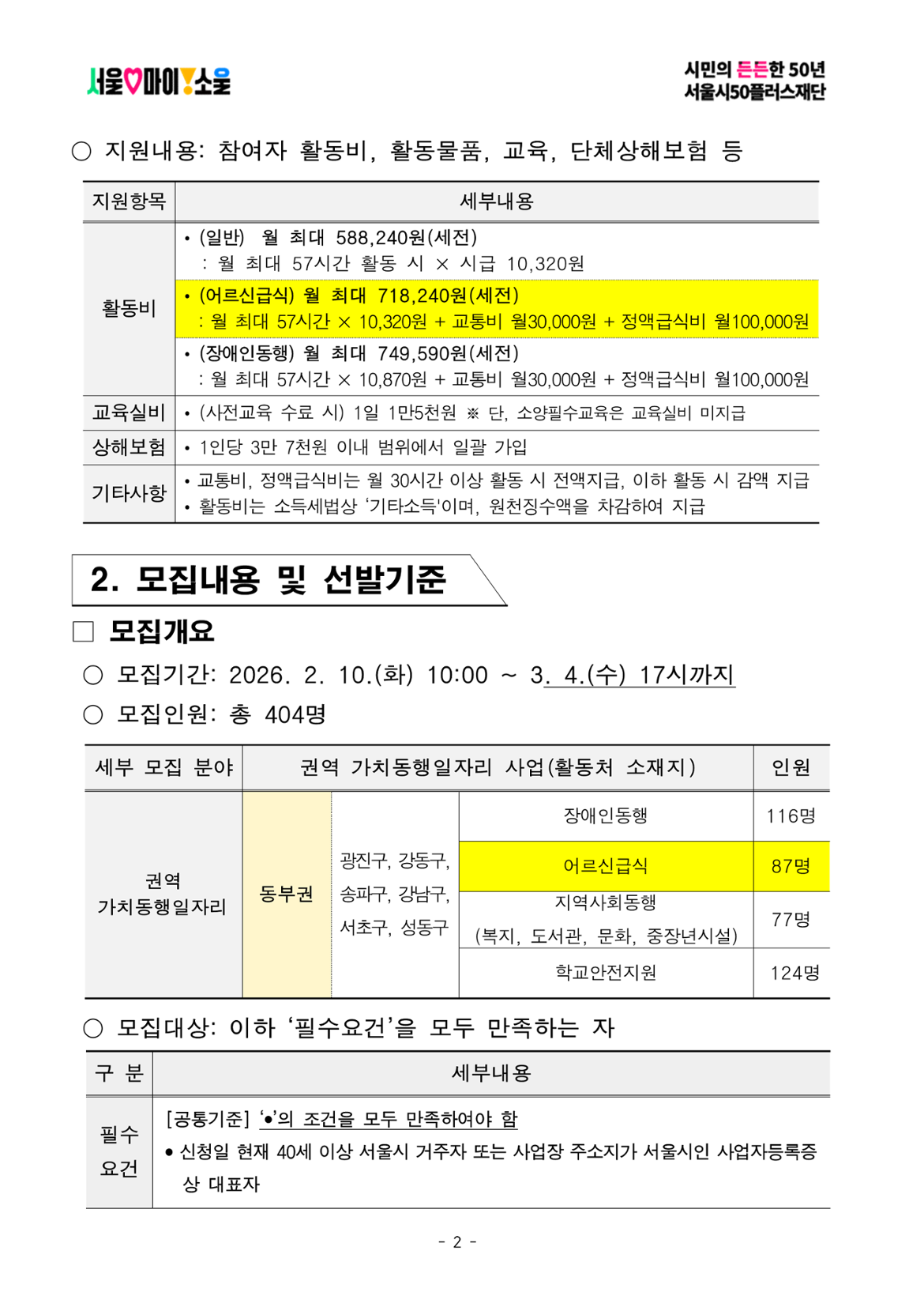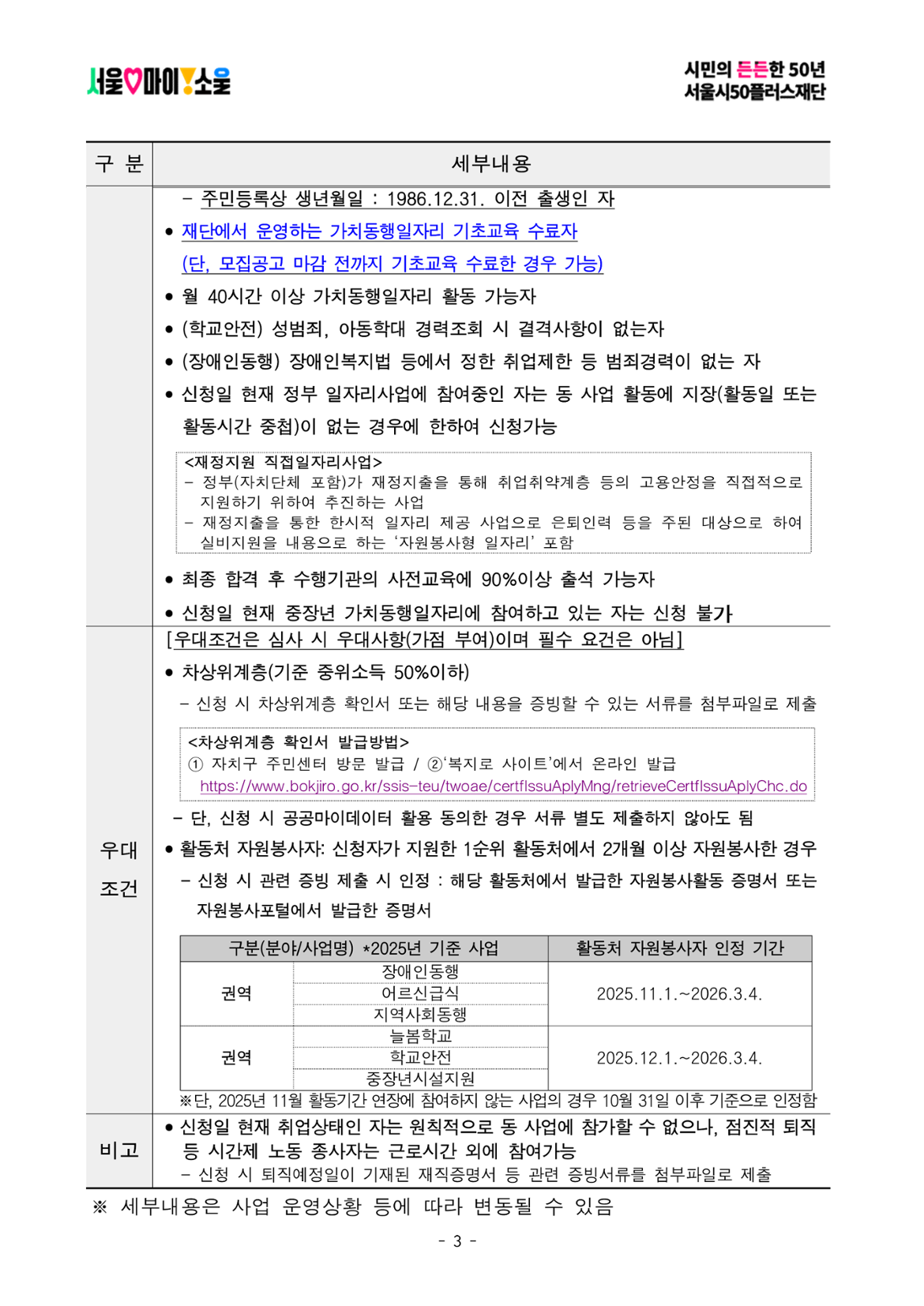 • 40세 이상(차상위 계층도 동일)인 자 중 주민등록상 서울시 거주자 또는 사업장 주소지가 서울시인 사업자등록증 상 대표자 • 월 활동시간(57시간) 중 70%(40시간)이상 활동이 가능한 자 • 모집공고 최종합격 후 참여자 사전교육 수료(90% 이상), 소양필수교육 수료(100%) 가능한 자 • 모집공고 마감일 전까지 재단에서 운영하는 가치동행일자리 기초교육 수료한 자