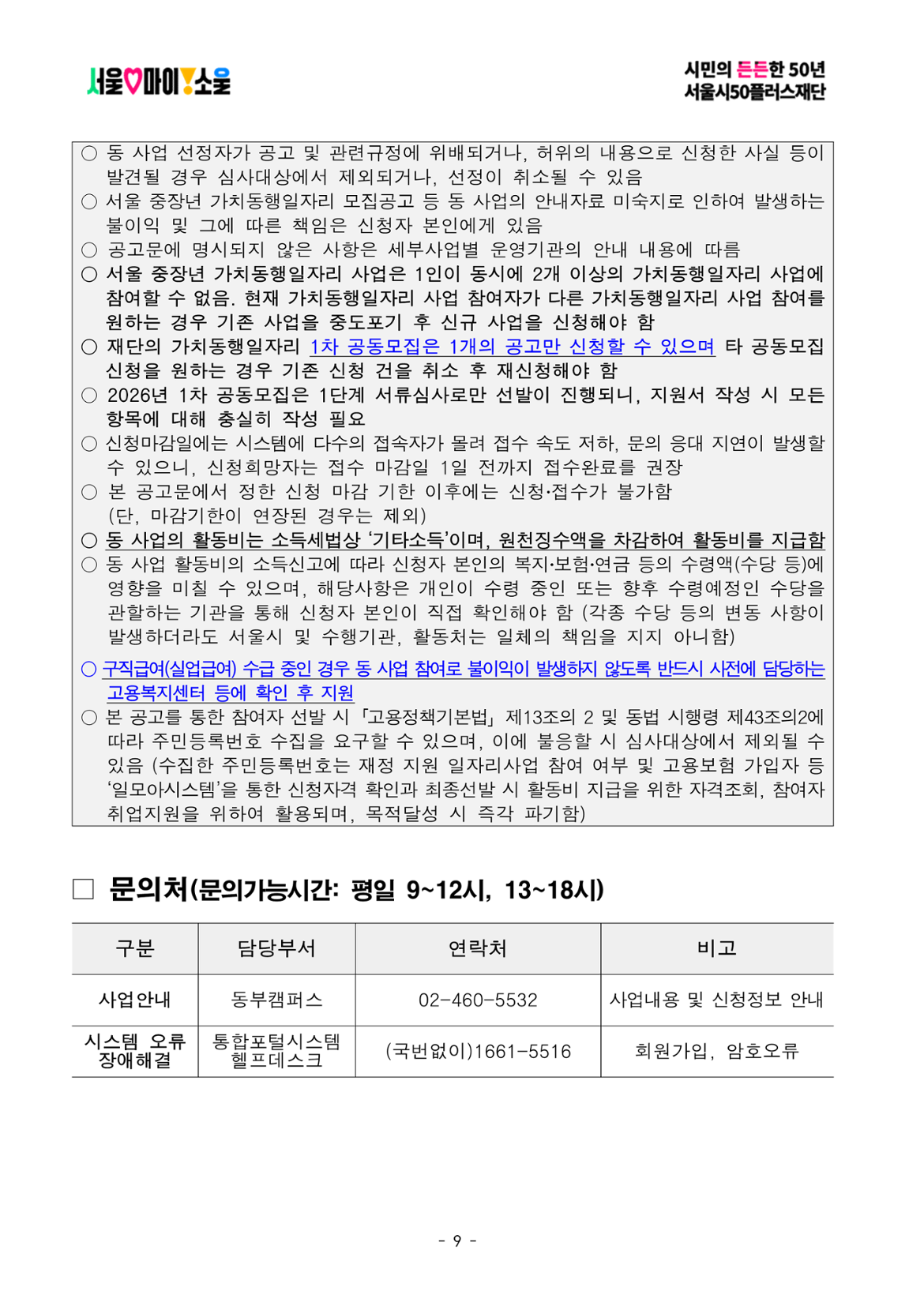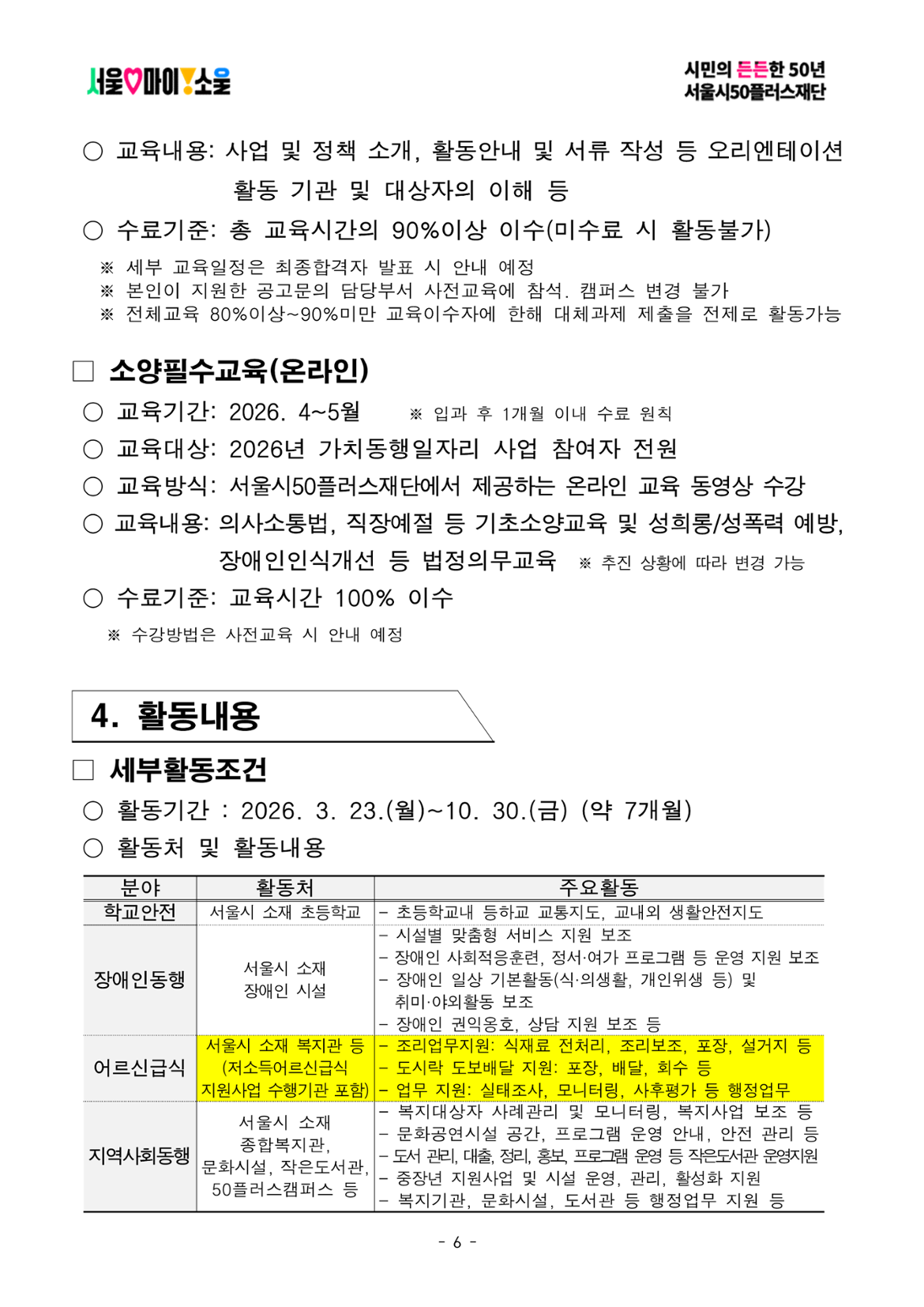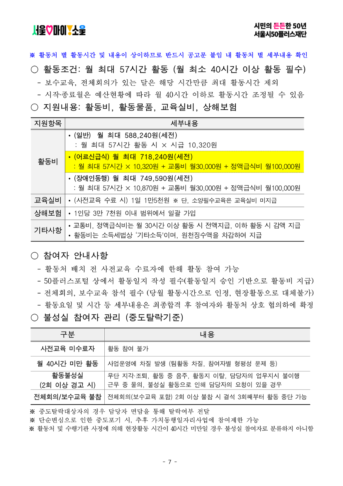 • 40세 이상(차상위 계층도 동일)인 자 중 주민등록상 서울시 거주자 또는 사업장 주소지가 서울시인 사업자등록증 상 대표자 • 월 활동시간(57시간) 중 70%(40시간)이상 활동이 가능한 자 • 모집공고 최종합격 후 참여자 사전교육 수료(90% 이상), 소양필수교육 수료(100%) 가능한 자 • 모집공고 마감일 전까지 재단에서 운영하는 가치동행일자리 기초교육 수료한 자