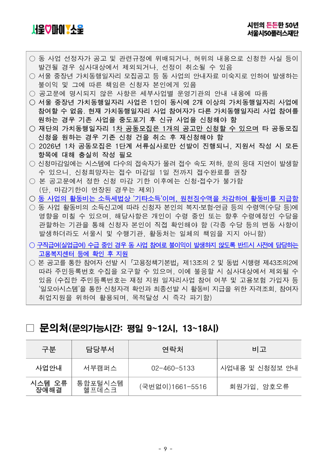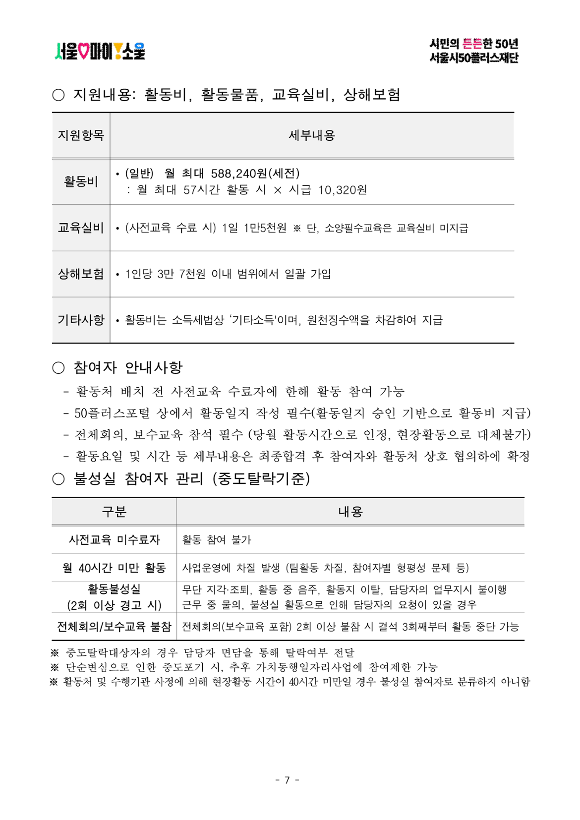 • 40세 이상(차상위 계층도 동일)인 자 중 주민등록상 서울시 거주자 또는 사업장 주소지가 서울시인 사업자등록증 상 대표자 • 월 활동시간(57시간) 중 70%(40시간)이상 활동이 가능한 자 • 모집공고 최종합격 후 참여자 사전교육 수료(90% 이상), 소양필수교육 수료(100%) 가능한 자 • 모집공고 마감일 전까지 재단에서 운영하는 가치동행일자리 기초교육 수료한 자