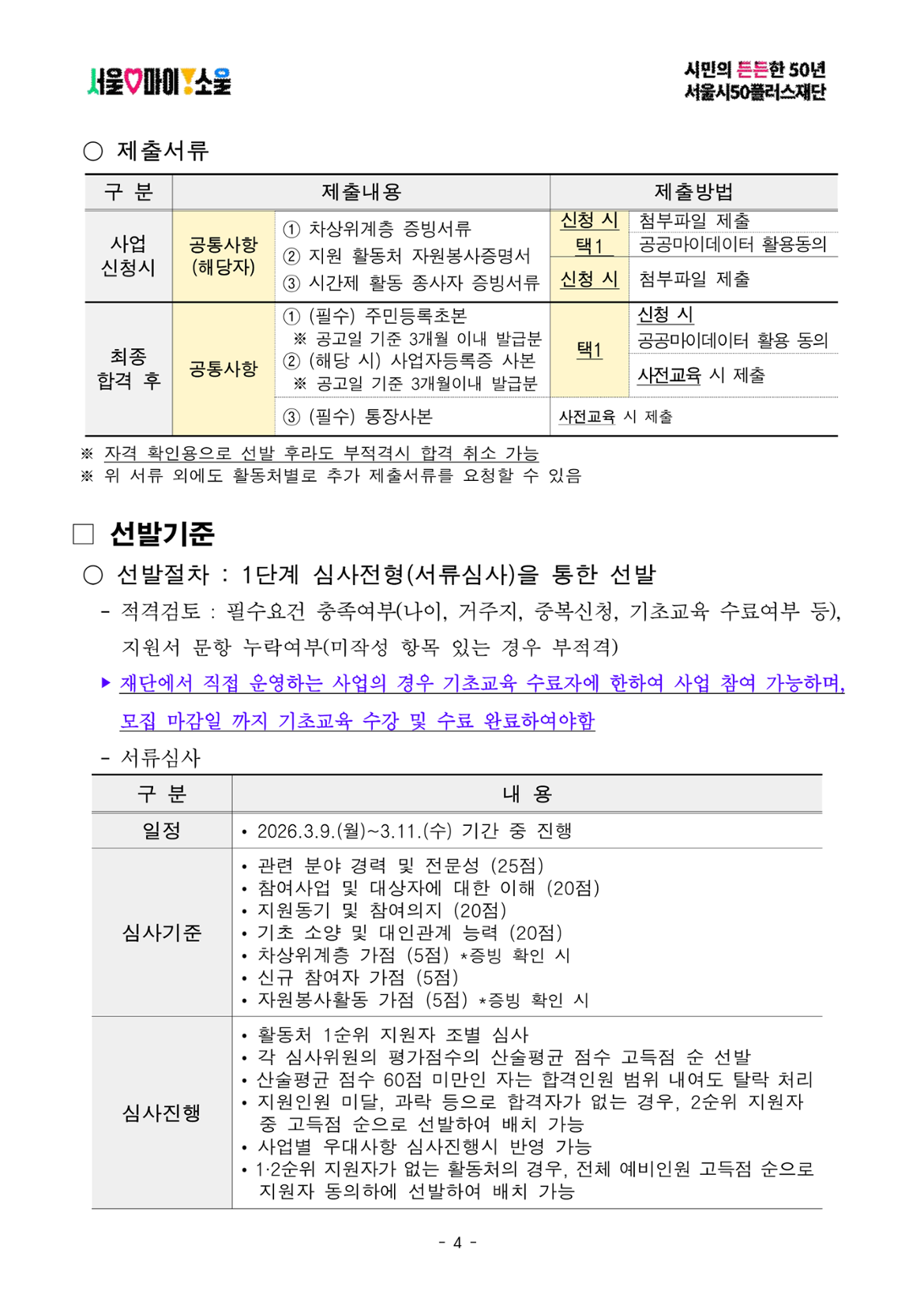 1. 신규 사업참여자 2. 활동처 자원봉사자: 신청자가 지원한 1순위 활동처에서 2025년 11월 1일~2026년 3월 4일 사이 2개월 이상 자원봉사 이력이 있는 자 3. 차상위계층(기준 중위소득 50%이하)인 자 ※ 1~3번 사항의 우대조건은 심사 시 우대사항이며, 필수요건은 아님 ※ 2~3번 사항은 온라인 신청 시 증빙서류 첨부 필수, 증빙서류 미첨부 시 가점 미부여