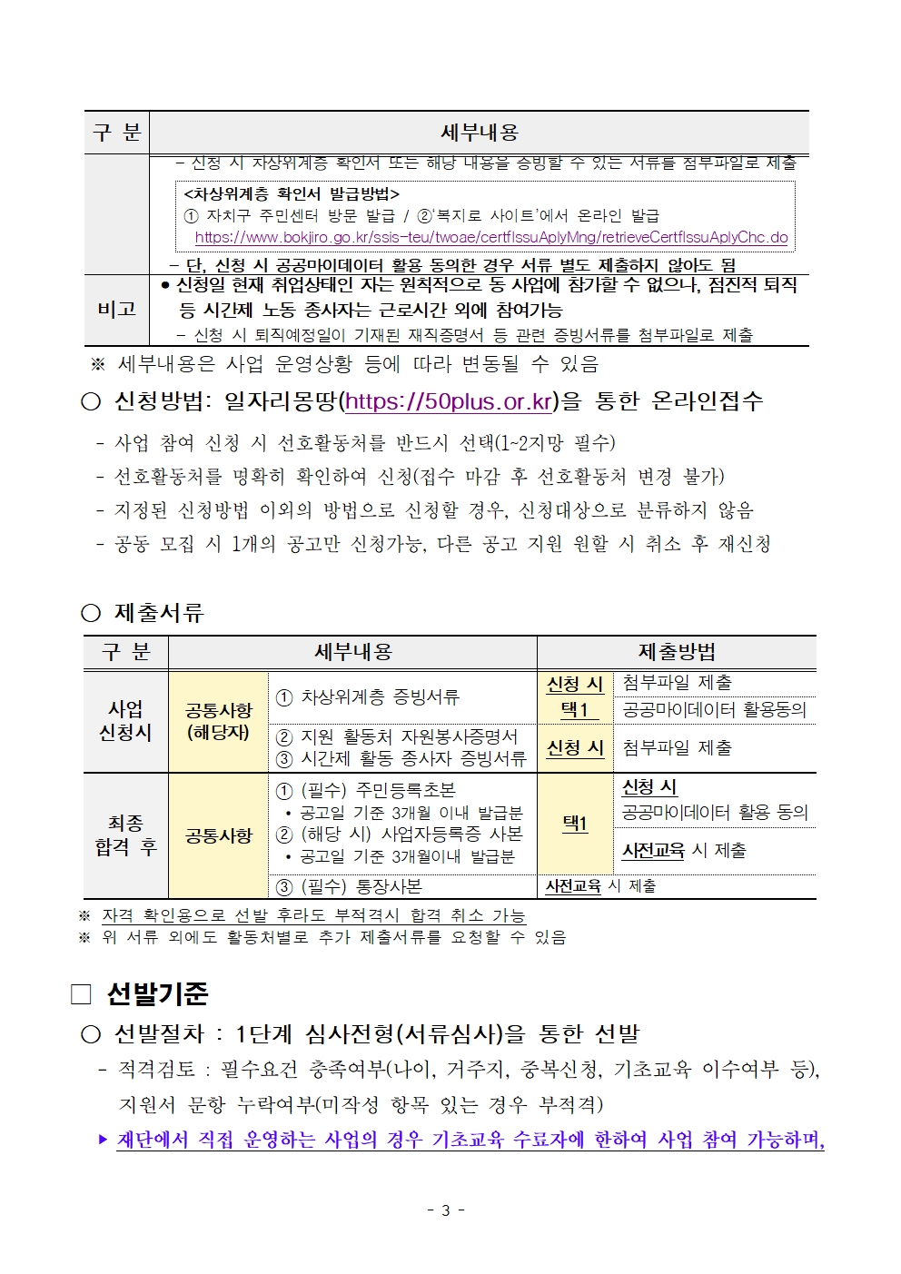문서 작성 가능자, 한글 및 엑셀 활용 가능 1) 신규 사업참여자 2) 차상위계층(기준 중위소득 50%이하)인 자 ※ 우대조건은 심사 시 우대사항이며, 필수요건은 아님 ※ 2번 사항 온라인 신청 시 증빙서류 첨부 필수, 증빙서류 미첨부 시 가점 미부여