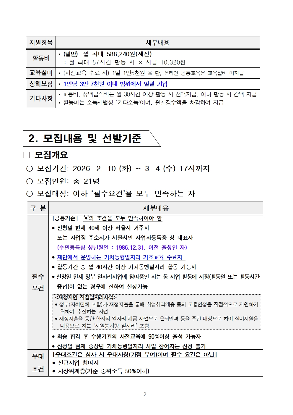 40세 이상 주민등록상 서울시 거주자 또는 사업장 주소지가 서울시인 사업자등록증 상 대표자 - 월 활동시간(57시간) 중 70%(40시간)이상 활동이 가능한 자 - 참여자 역량교육 수료(90%이상), 소양교육 수료(100%) 가능한 자 - 재단에서 운영하는 가치동행일자리 기초교육 수료자