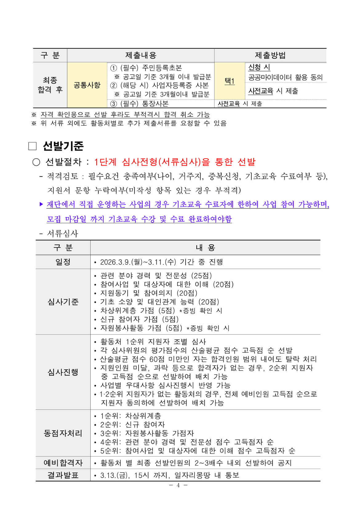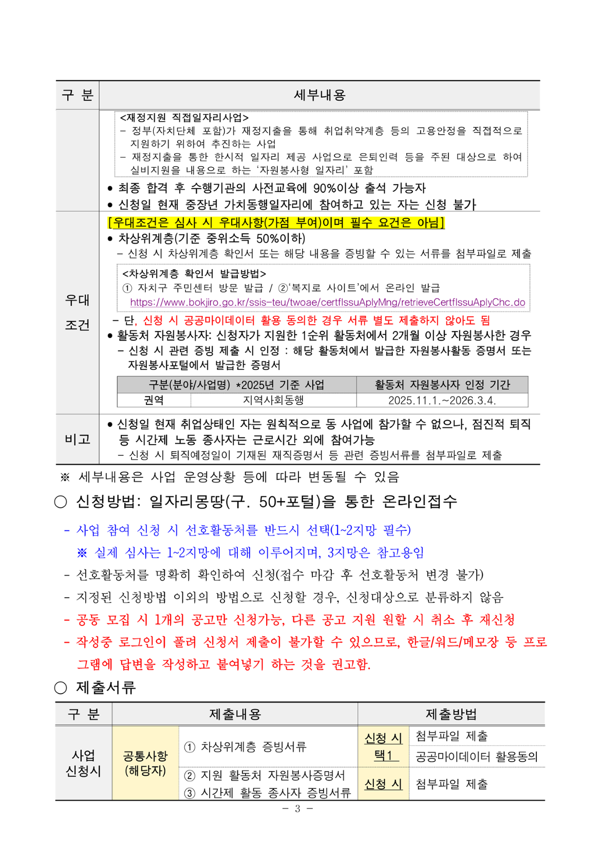 1) 신규 사업참여자 2) 활동처 자원봉사자: 신청자가 지원한 1순위 활동처에서 2025년 11월 1일~2026년 3월 4일 사이 2개월 이상 자원봉사 이력이 있는 자 3) 차상위계층(기준 중위소득 50%이하)인 자 ※ 1~3번 사항의 우대조건은 심사 시 우대사항이며, 필수요건은 아님 ※ 2~3번 사항은 온라인 신청 시 증빙서류 첨부 필수, 증빙서류 미첨부 시 가점 미부여