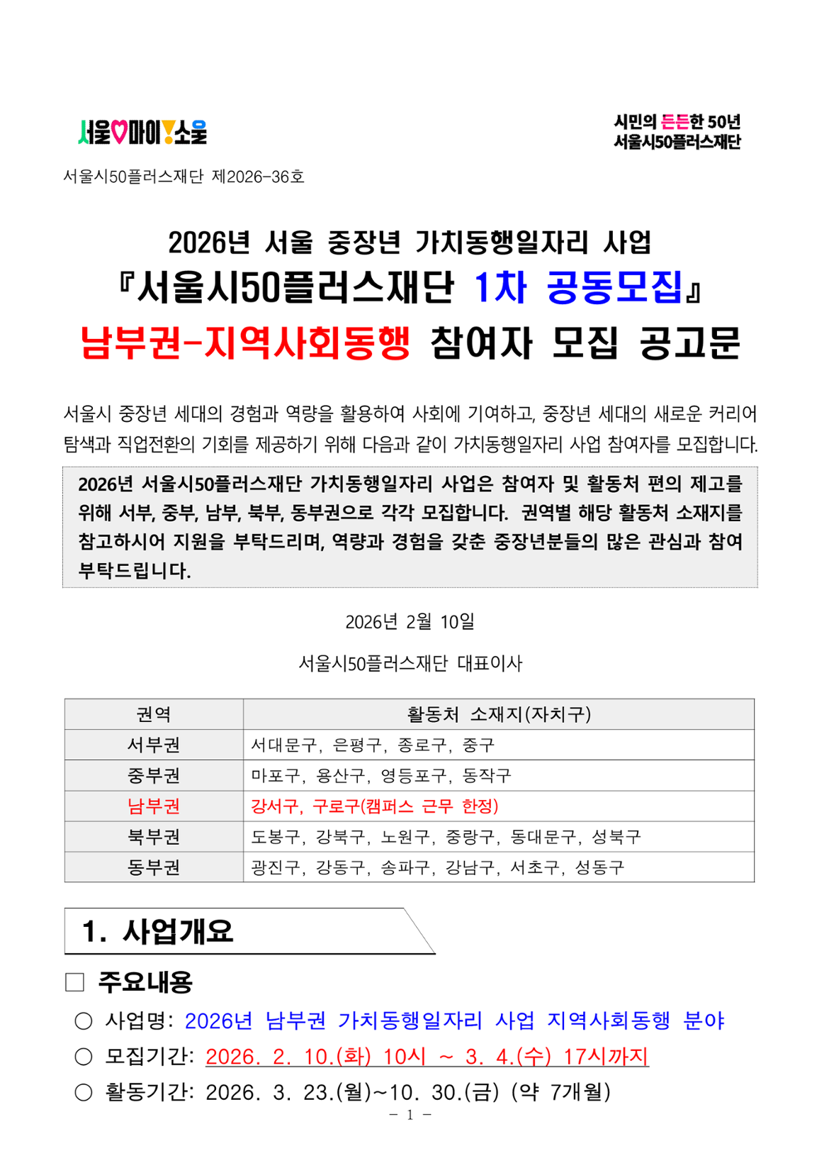 서울시50플러스재단 남부권 지역사회동행(1차 공동모집)
