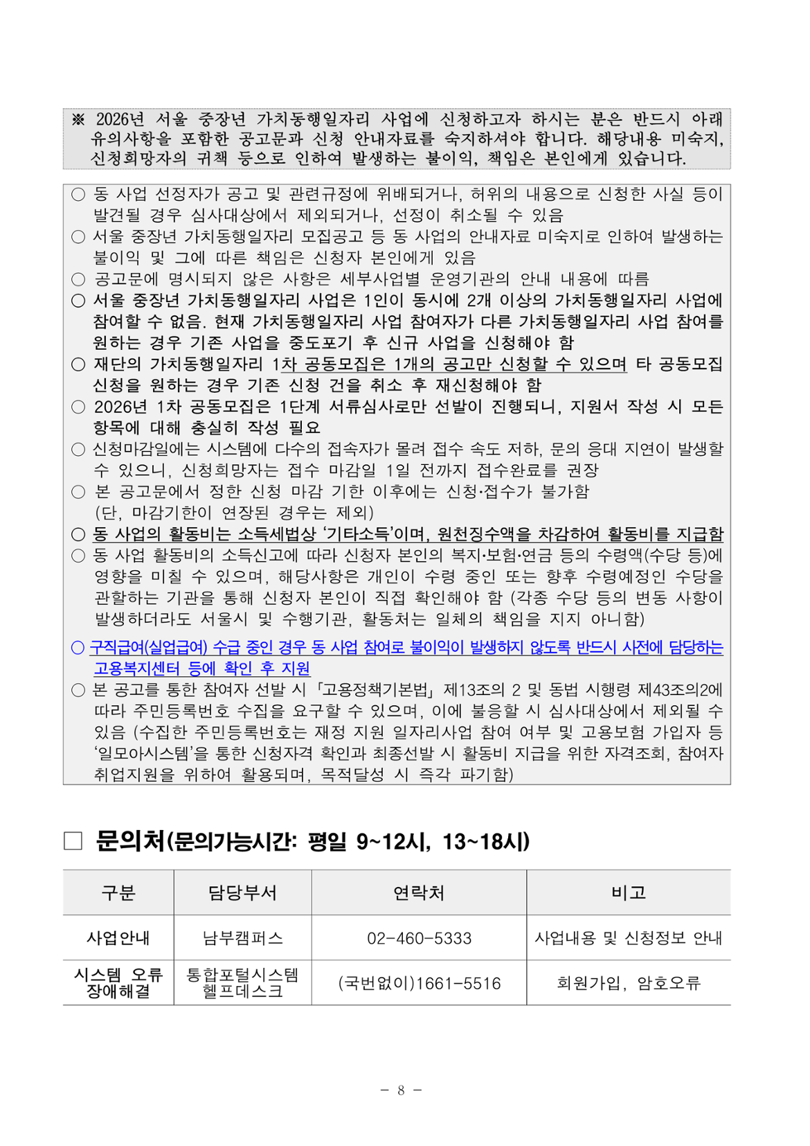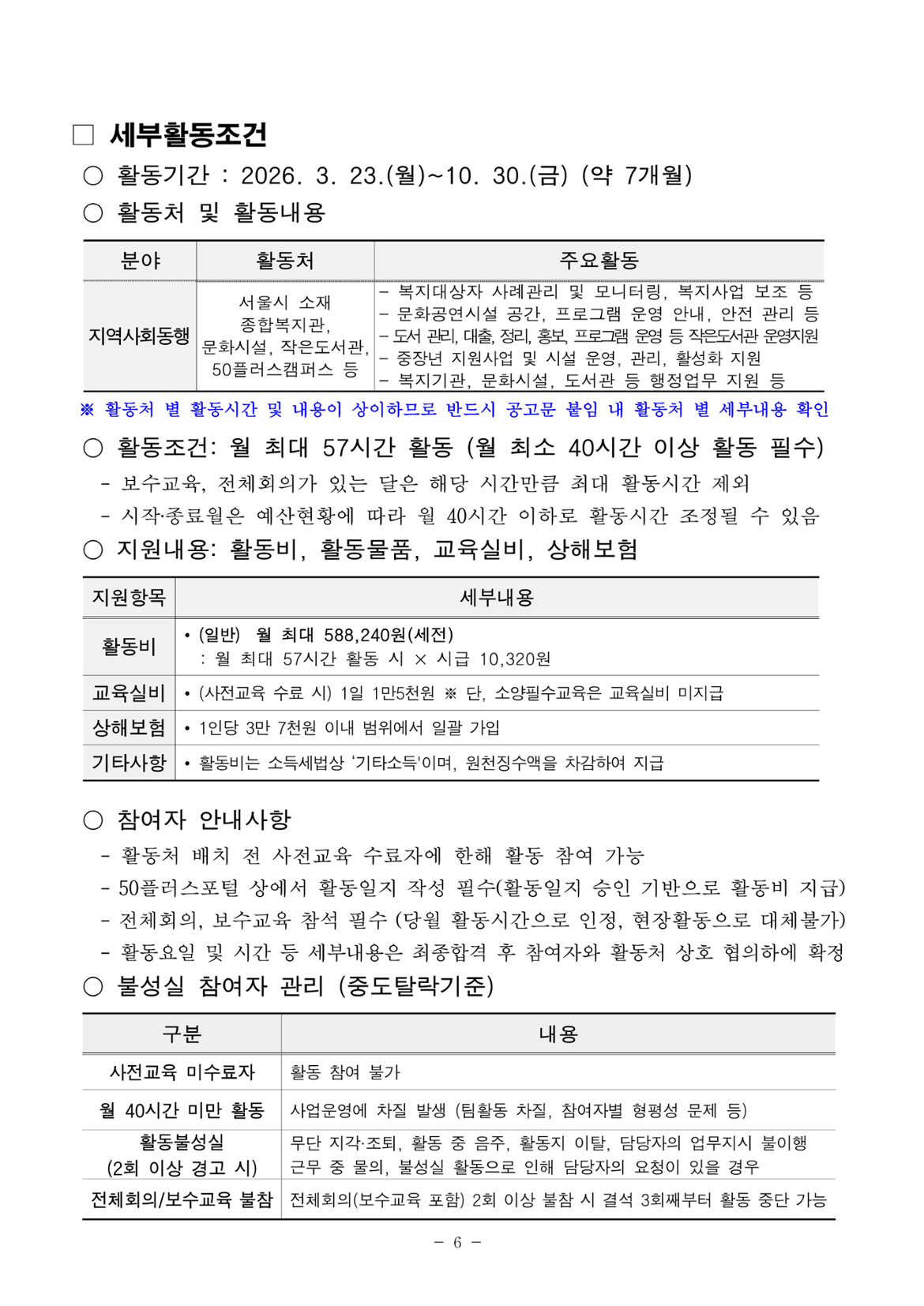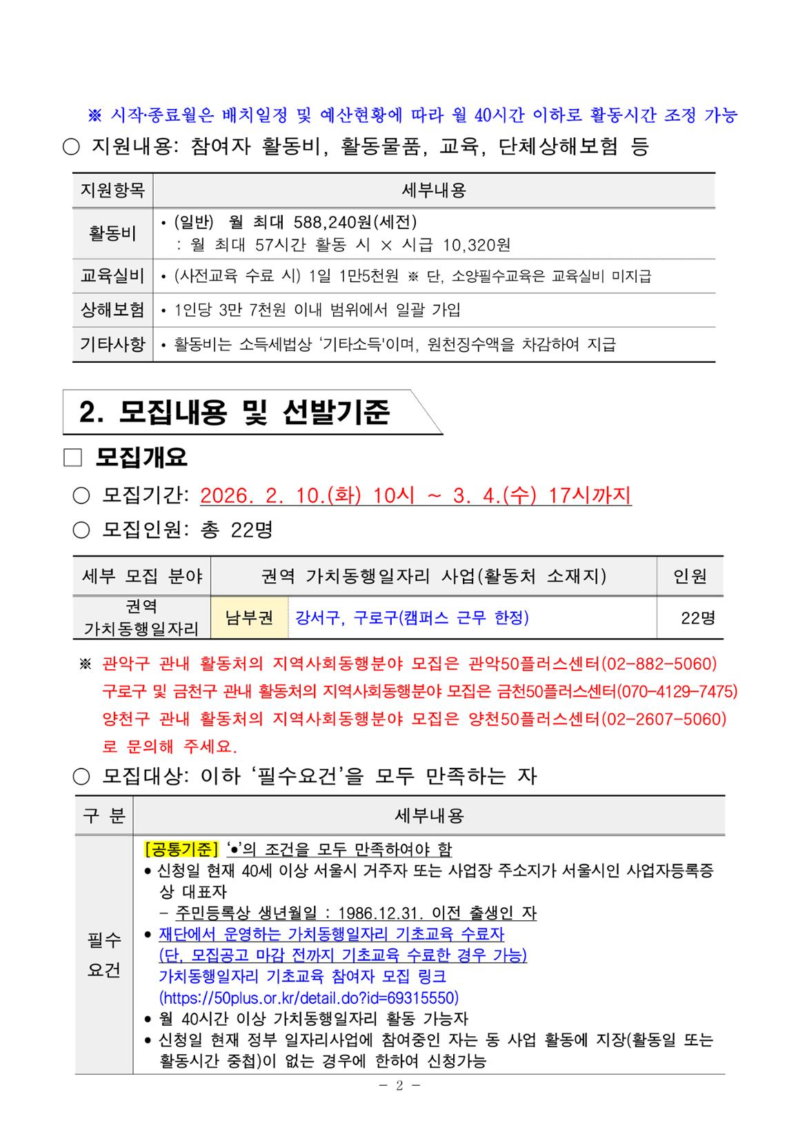 • 40세 이상(차상위 계층도 동일)인 자 중 주민등록상 서울시 거주자 또는 사업장 주소지가 서울시인 사업자등록증 상 대표자 • 월 활동시간(57시간) 중 70%(40시간)이상 활동이 가능한 자 • 모집공고 최종합격 후 참여자 사전교육 수료(90% 이상), 소양필수교육 수료(100%) 가능한 자 • 모집공고 마감일 전까지 재단에서 운영하는 가치동행일자리 기초교육 수료한 자