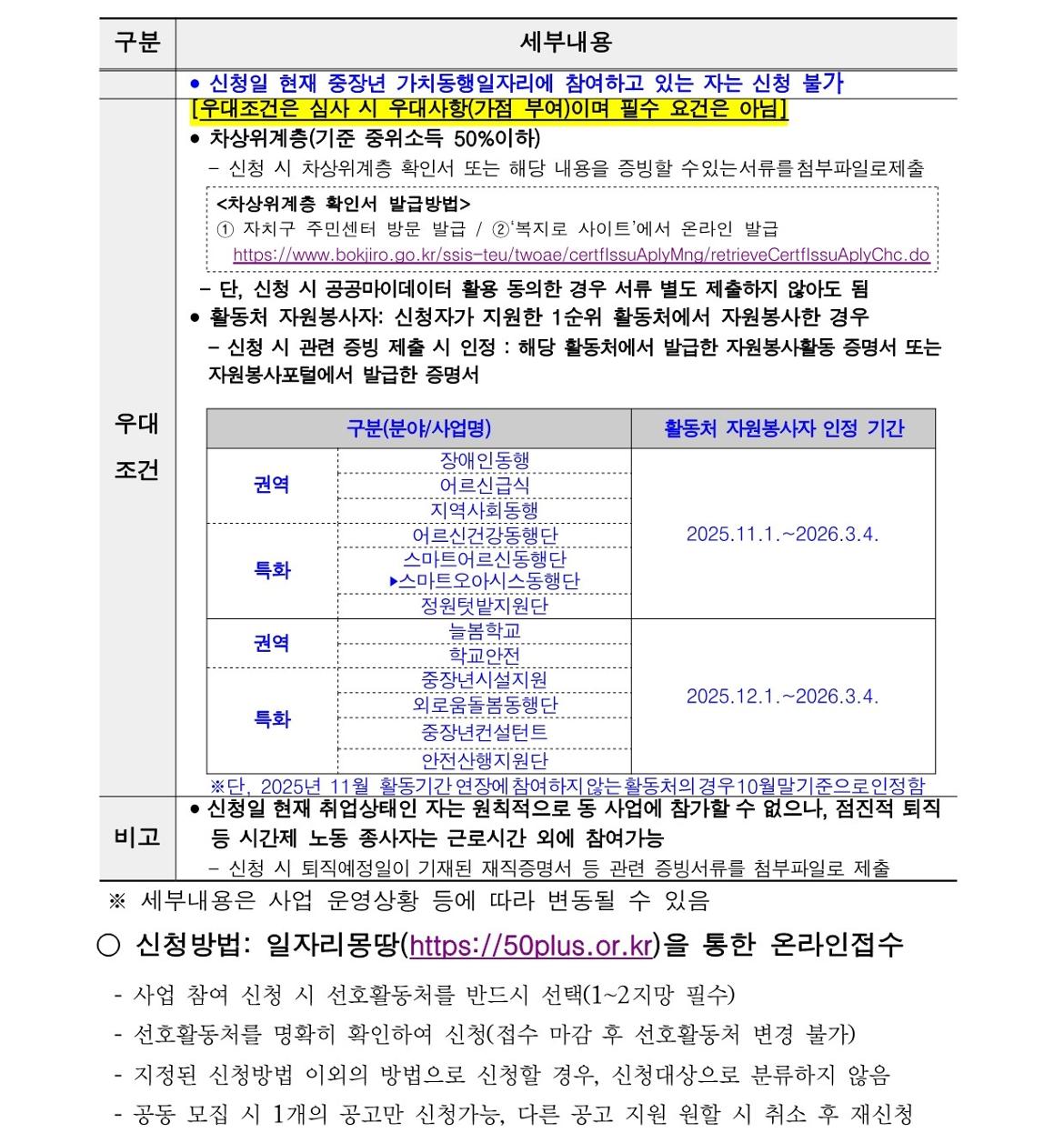 [우대요건] 1) 신규 사업참여자 2) 활동처 자원봉사자: 신청자가 지원한 1순위 활동처에서 2025년 11월 1일~2026년 3월 4일 사이 2개월 이상 자원봉사 이력이 있는 자 3) 차상위계층(기준 중위소득 50%이하)인 자 ※ 1~3번 사항의 우대조건은 심사 시 우대사항이며, 필수요건은 아님 ※ 2~3번 사항은 온라인 신청 시 증빙서류 첨부 필수, 증빙서류 미첨부 시 가점 미부여