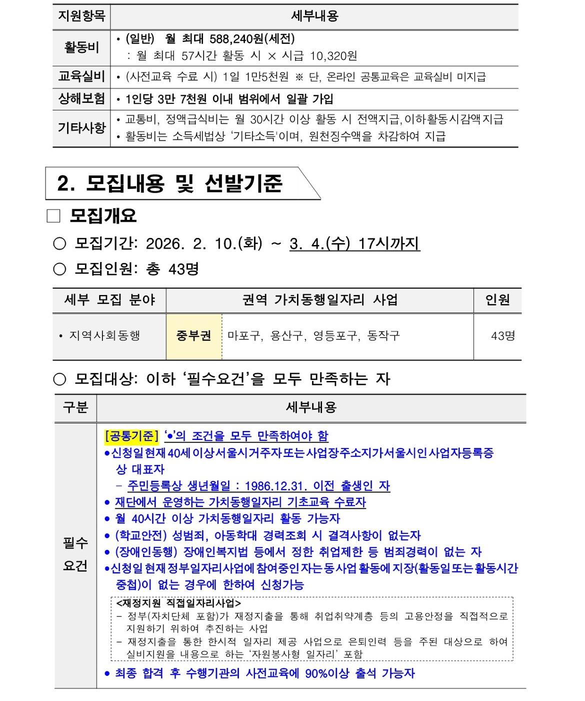 • 40세 이상(차상위 계층도 동일)인 자 중 주민등록상 서울시 거주자 또는 사업장 주소지가 서울시인 사업자등록증 상 대표자 • 월 활동시간(57시간) 중 70%(40시간)이상 활동이 가능한 자 • 모집공고 최종합격 후 참여자 사전교육 수료(90% 이상), 소양필수교육 수료(100%) 가능한 자 • 모집공고 마감일 전까지 재단에서 운영하는 가치동행일자리 기초교육 수료한 자