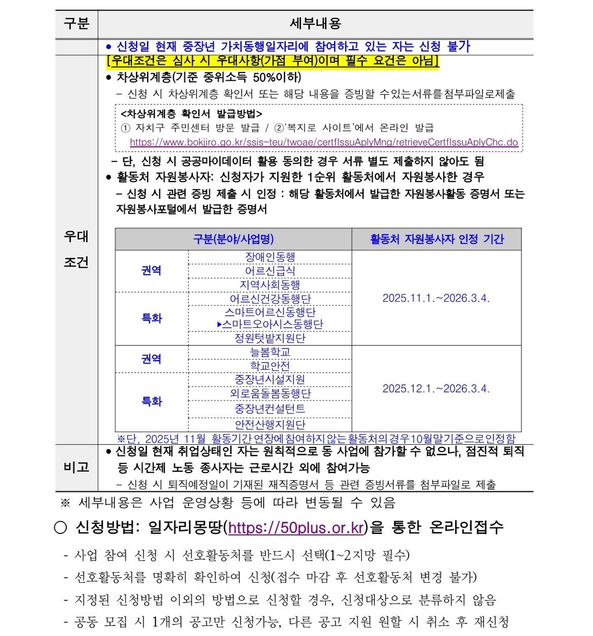 1) 신규 사업참여자 2) 활동처 자원봉사자: 신청자가 지원한 1순위 활동처에서 2025년 11월 1일~2026년 3월 4일 사이 2개월 이상 자원봉사 이력이 있는 자 3) 차상위계층(기준 중위소득 50%이하)인 자 ※ 1~3번 사항의 우대조건은 심사 시 우대사항이며, 필수요건은 아님 ※ 2~3번 사항은 온라인 신청 시 증빙서류 첨부 필수, 증빙서류 미첨부 시 가점 미부여